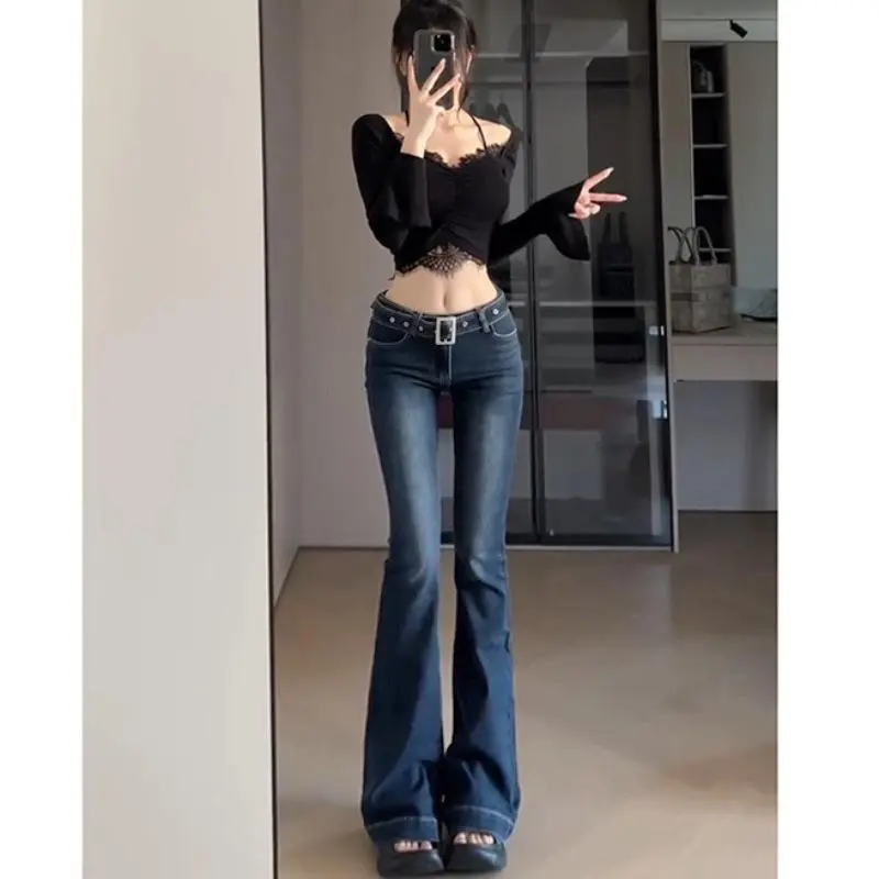 Elevate your wardrobe with these vintage Y2K bootcut denim pants. Perfect for a retro 70s vibe, they offer a slim fit with stretchy material. Ideal for casual streetwear, these bell bottom trousers are a classic all-match fashion bottom. Pair them with any outfit for a timeless look.