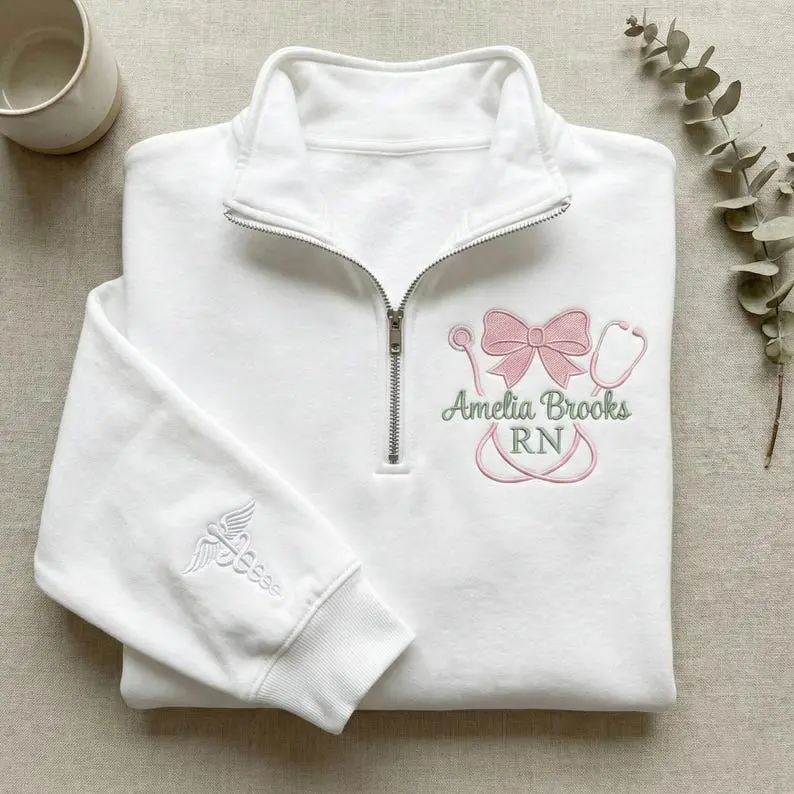 [MADE IN US] Custom Nurse Embroidered Quarter Zip, Personalized RN Pullover, Coquette Nurse Gift with Bow, Amelia Brooks RN Sleeve Embroidery