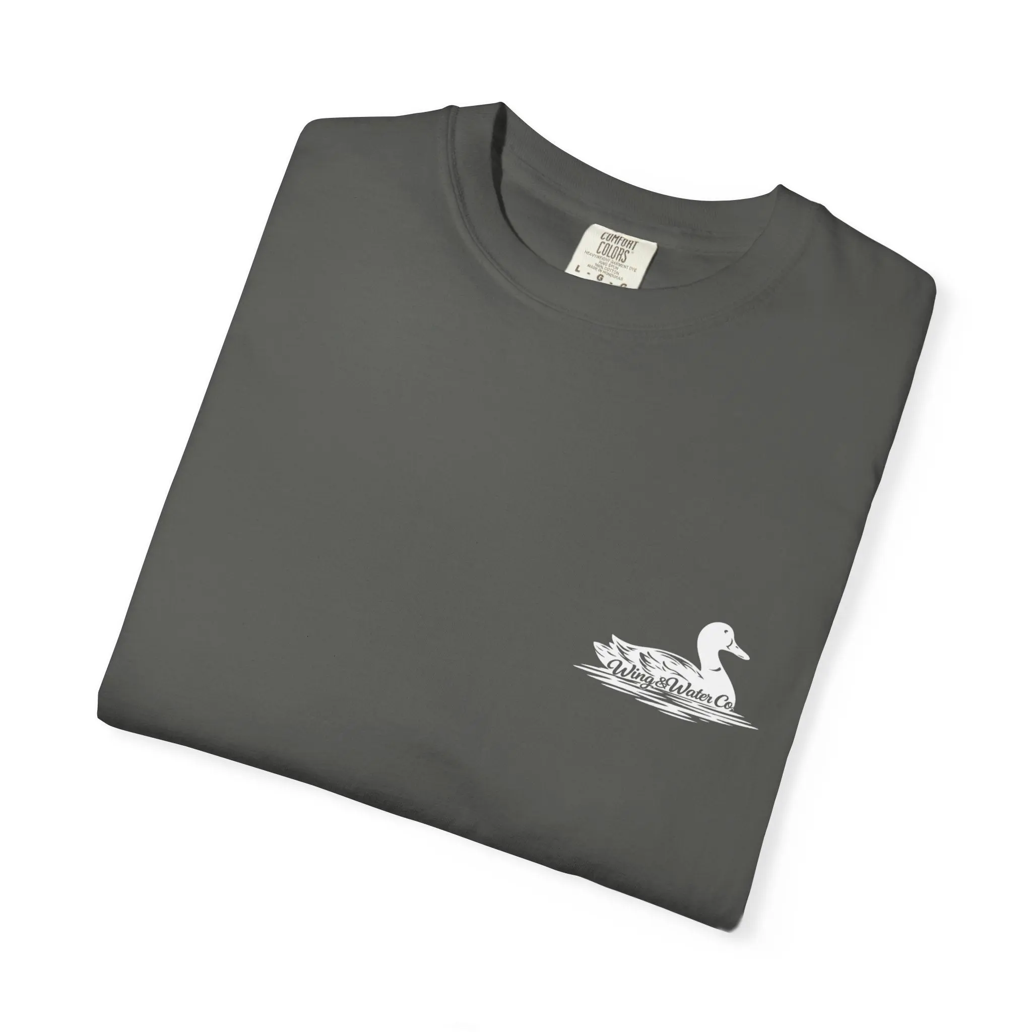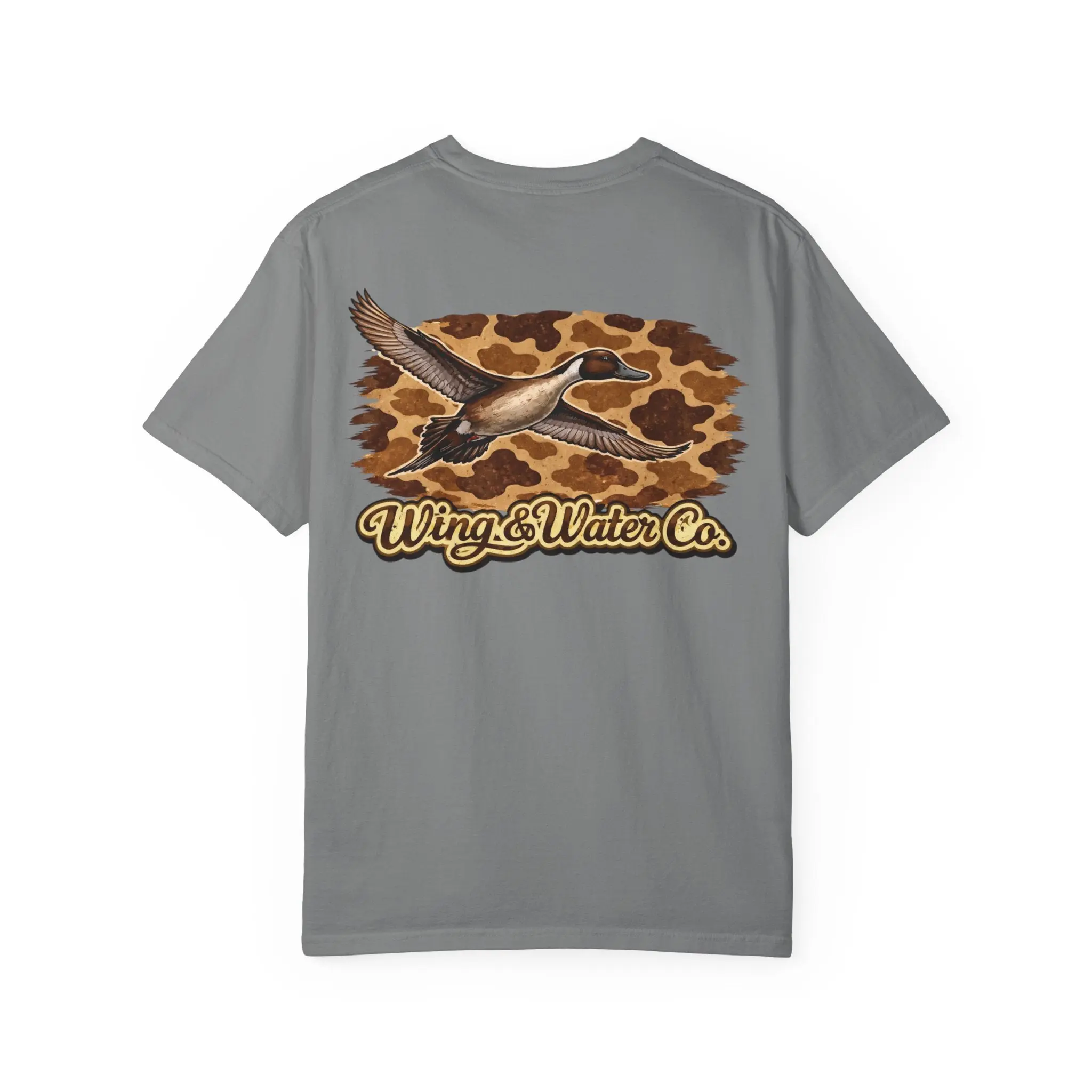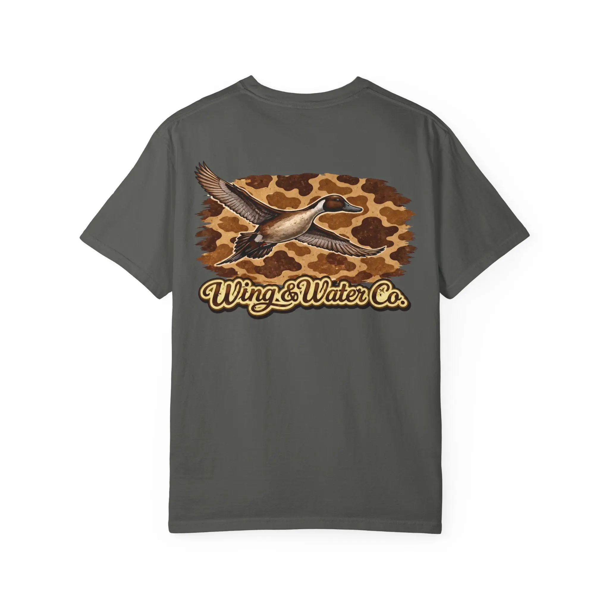Soft, heavyweight cotton with a lived-in, garment-dyed finish—this relaxed tee carries a quiet outdoorsy vibe. A small, detailed duck sits over the heart, while a bold flying-duck graphic with warm, camouflage-inspired tones and “Wing & Water Co.” lettering spans the back. It feels like a morning on the marsh: earthy, steady, and made for moving through wind and water. Wear it with worn denim or layered under a flannel when you’re heading out at first light, or keep it as a go-to for slow afternoons around the lodge. The weight and relaxed cut give it structure without stiffness; the dye and soft texture make it age into something personal and familiar.