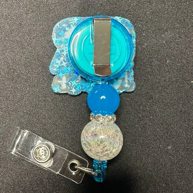 This listing is a badges reel design come with bell clip acrylic and silicone beads.