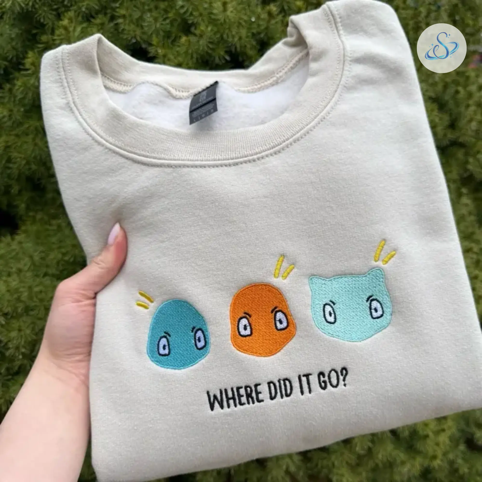 Where Did It Go Embroidered Crewneck Sweatshirt, Cute Monster Trio Graphic Pullover for Women Men, Funny Gamer Gift, Cozy Unisex Anime-Inspired Casual Top