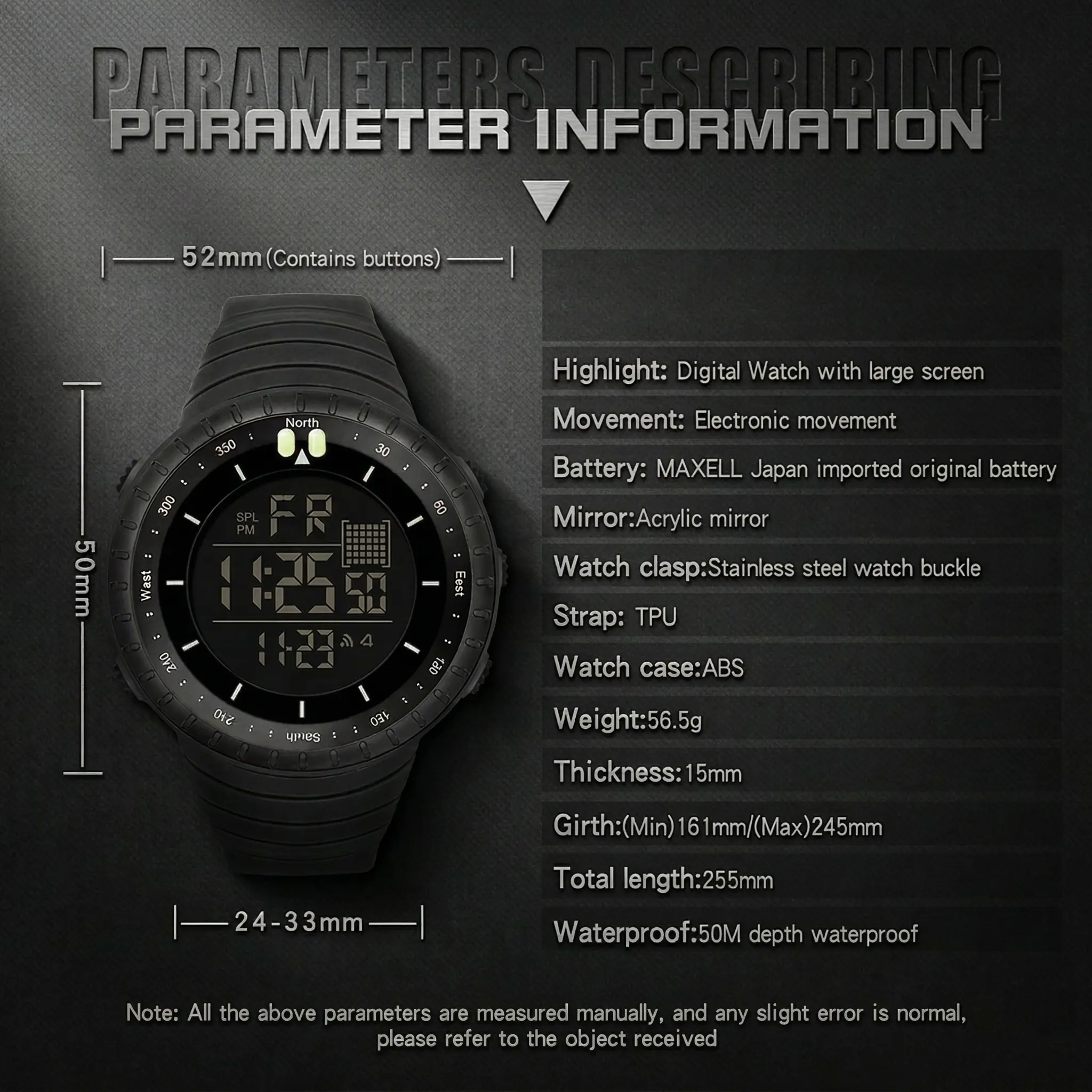 Water Resistant to 50M / 164FT : Digital watch men waterproof,wash hand,get wet in the rain and so on,it can satisfy all the daily needs(Warnning:No shower,sunna,diving,water-related work.Please DO NOT press any buttons underwater)