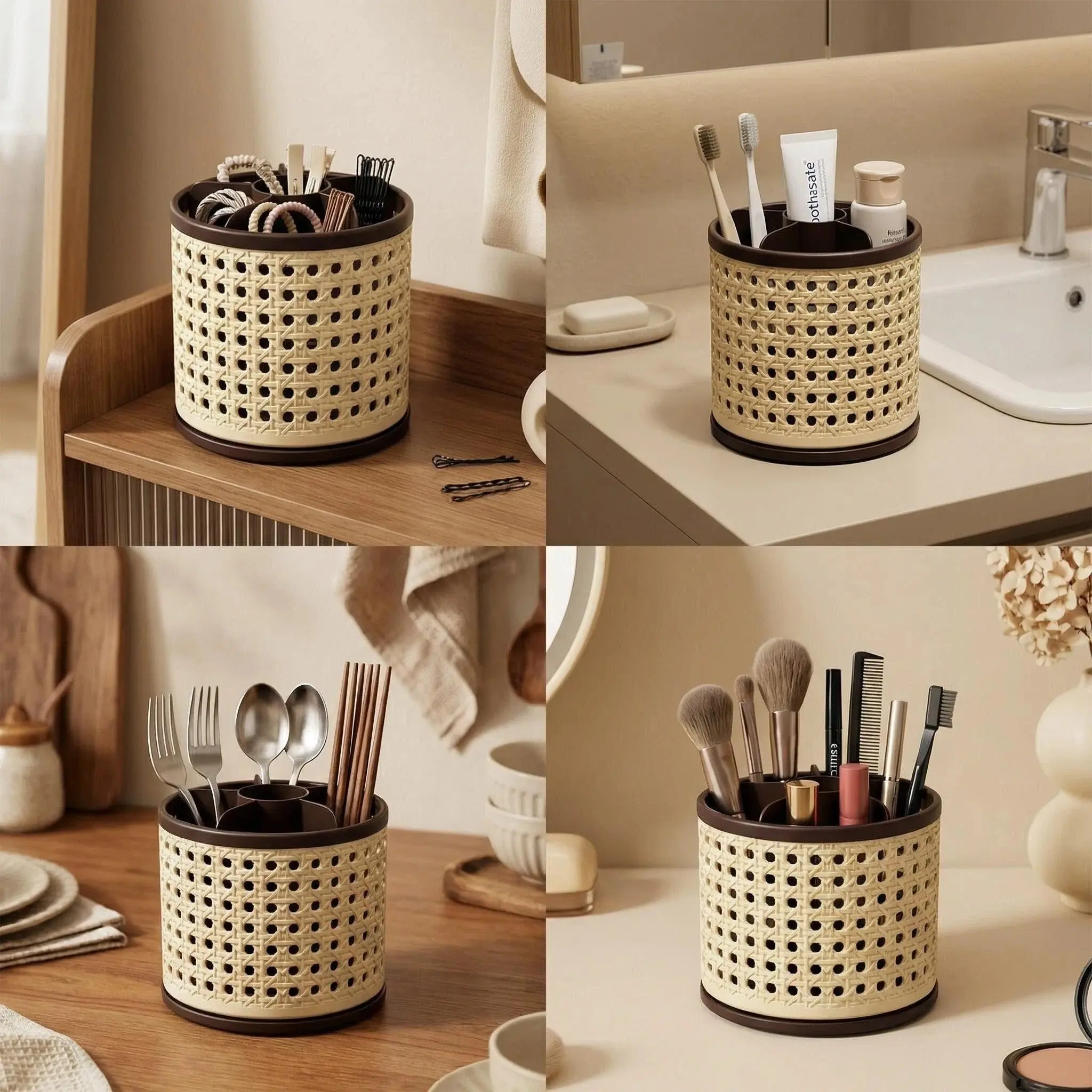 5. Vintage Woven Makeup Organizer, Large Capacity Rotating Desk Pen Holder, Detachable Easy Clean Compartment Brush Storage Box