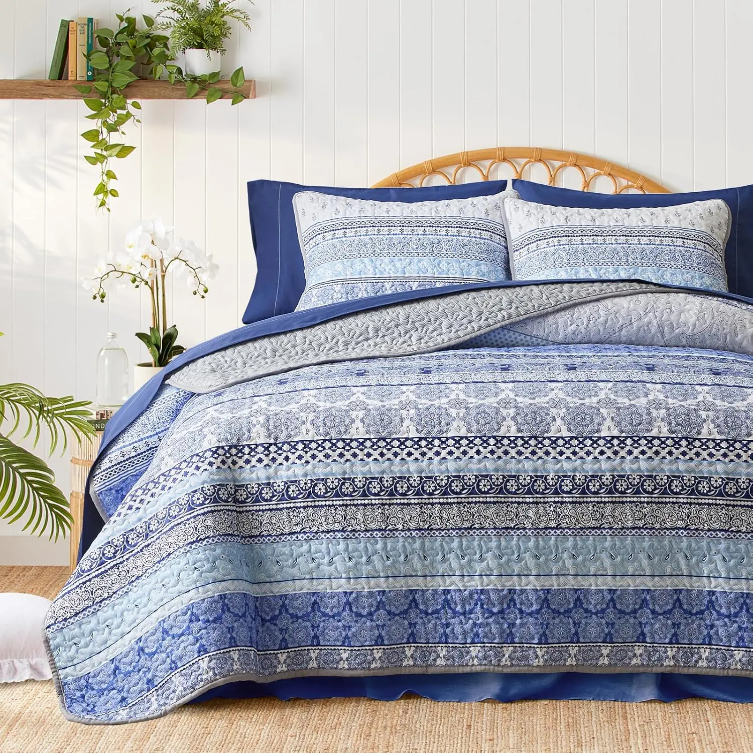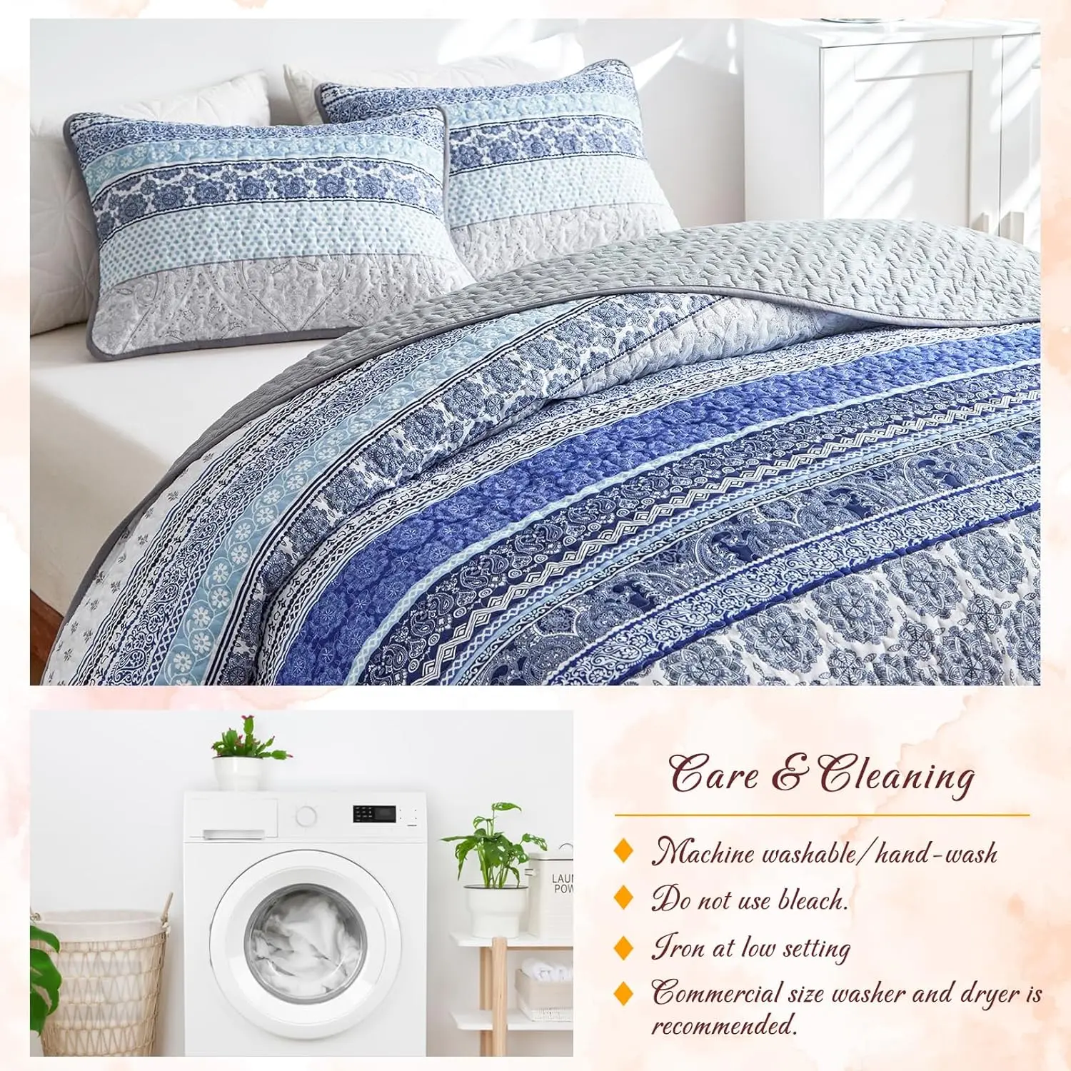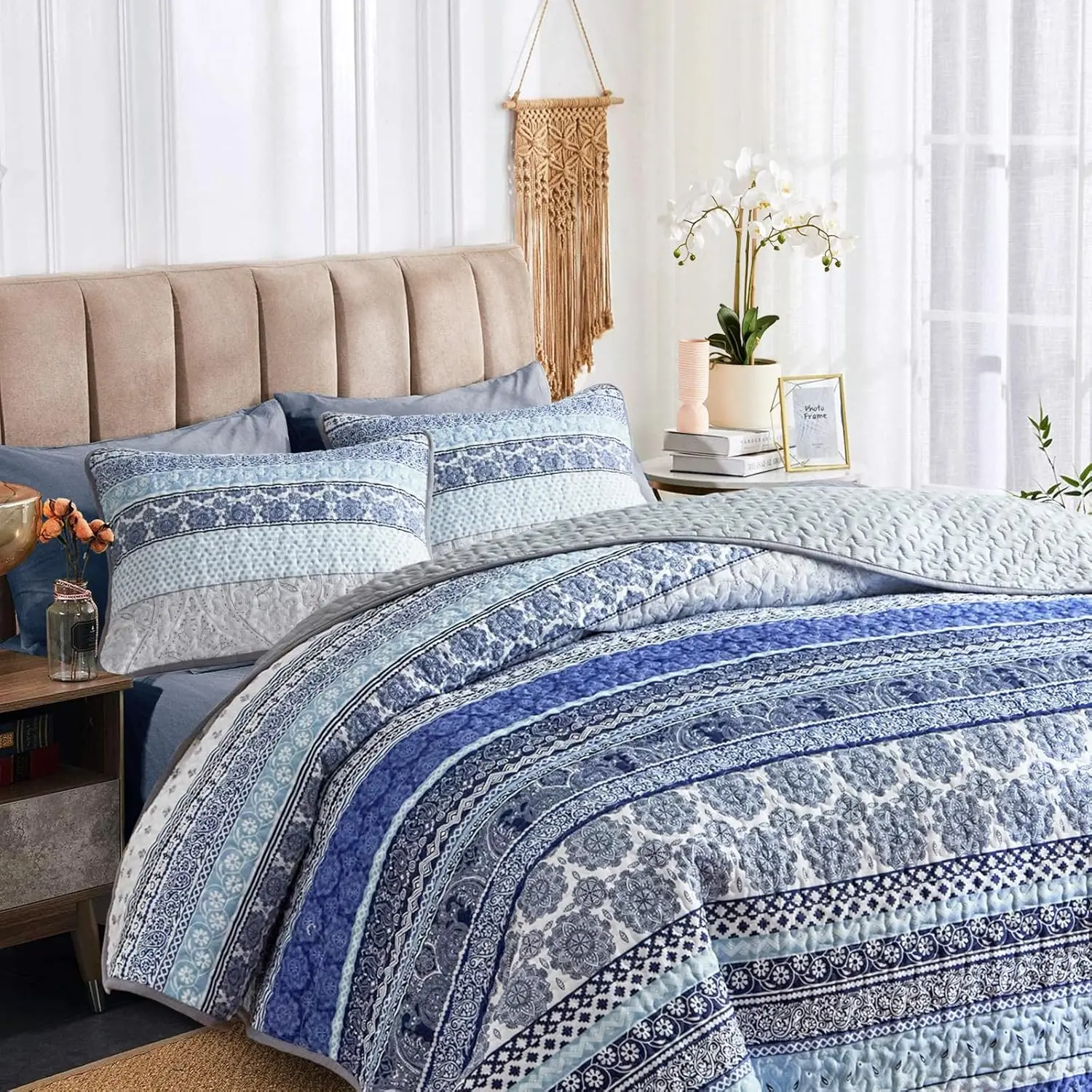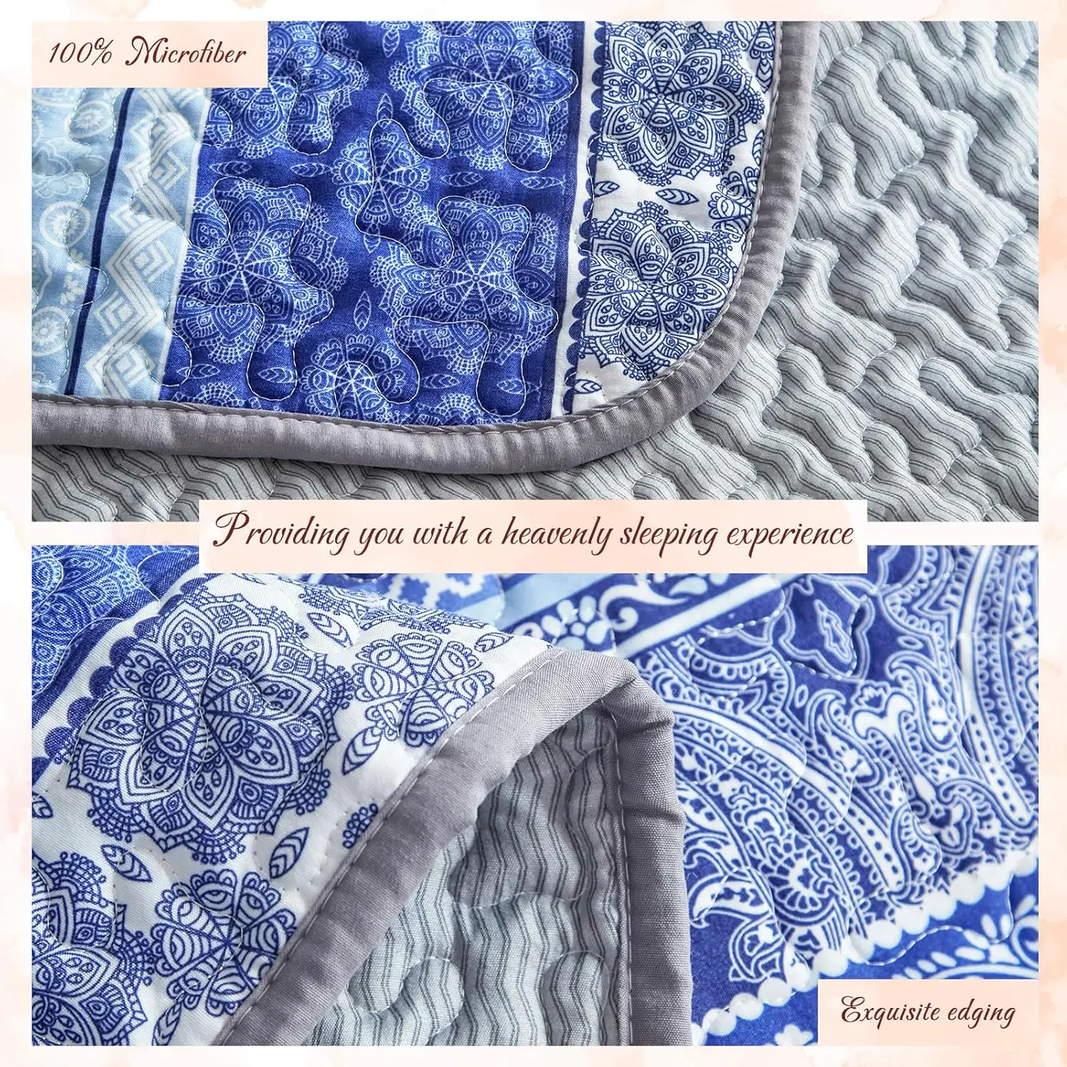 2 PIECES TWIN QUILT SET - Includes 1 reversible quilt (68" x 86") and 1 sham (20" x 26"), No Pillow Insert Includes. 100% soft microfiber, quilted with high quality 220 GSM fiber. Tips: Come with VACUUM PACKAGED, pick up and put on bed and released for 10 minutes, the quilt would be more soft!Blue Stripes Design - Beautiful blue and gray lightweight bedding set, elegant and luxury pattern attracts your eyes and update room with bright bohemian tribal style.LIGHTWEIGHT - If you have night sweats, this bedspread is perfect to offer comfortable and breathable sleep, It is lightweight but enough warm at night.MACHINE WASHABLE - Easy clean, wash in cold water with similar color, tumble dry low and iron when needed, no Bleach.CUSTOMER SHOPPING EXPERIENCE - Thank you for supporting our small business, feel free to contact with us at, we will help you asap!