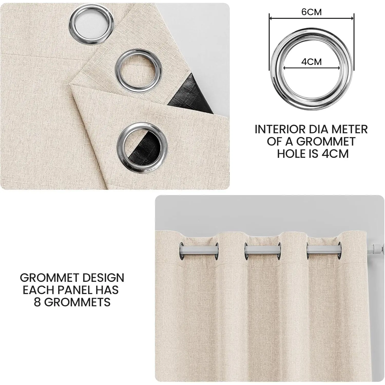 LinenPair Sold: Package contains 2 blackout curtains, each 52" w x 96" l (104" total width).As handmade products, they May vary up to 1 inch.Thread trimmed and wrinkle free, panel is constructed with 8 anti rust grommets which fit well up to 1 1/2 inches curtain rodsLinen 100% Blackout Curtains: Experience ultimate darkness for perfect, uninterrupted sleep.Crafted with a stitched‑in blackout liner and a deep, light‑absorbing black backing, these linen blackout curtains and UV rays to deliver enhanced total darkness-ideal for late sleepers, night‑shift workers, and nurseries.Elegant Linen-Like Texture: CYCMACO Linen blackout curtains for bedroom are crafted from rich linen-like fabric (100% polyester), these 100% blackout curtains are designed textured, llinen-like fabric on the front, offering a flawless look from every viewpointwith a soft drape and a built-in blackout liner, they bring a seamless blend of style and function to your bedroom or living room.Energy-Efficient Thermal Curtains: CYCMACO Thermal curtains feature a deep, heat‑absorbing black backing liner-designed to enhance winter warmth retention while providing superior year‑round insulation.They also reduce outside noise and suit any room style, for a comfortable, quiet home in every season.Luxurious Look & Easy Care: Shopping with CYCMACO Linen-like grommet curtains with light‑absorbing black backing, enjoy the high-end texture of linen without the maintenance headaches.Unlike real linen, these room darkening curtains are completely machine washable, wrinkle-resistant, and resistant to shrinkage.For effortless care, simply wash them in cold water, use non-chlorine bleach if needed, and tumble dry on a low setting.