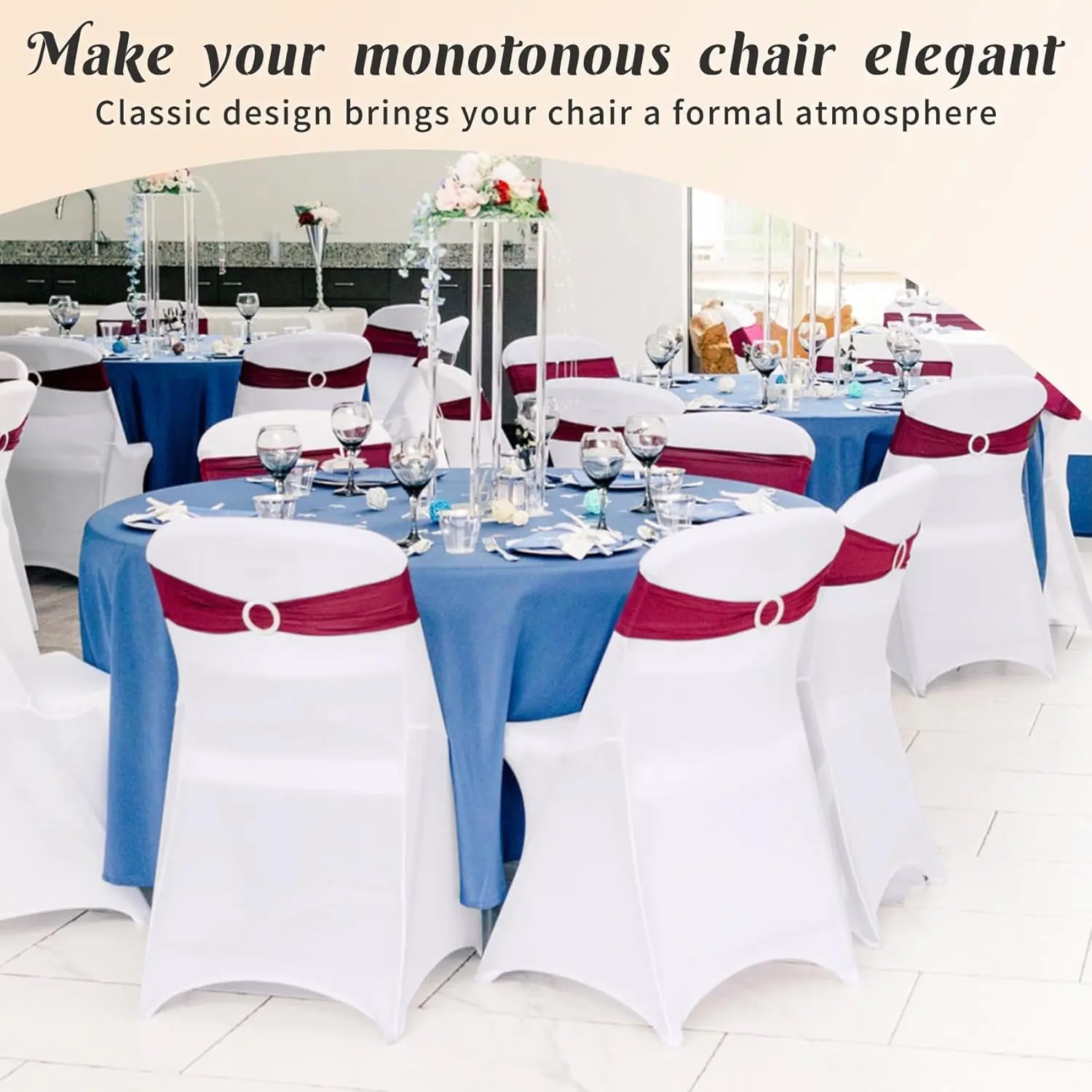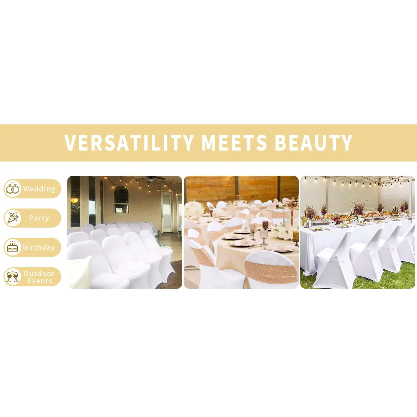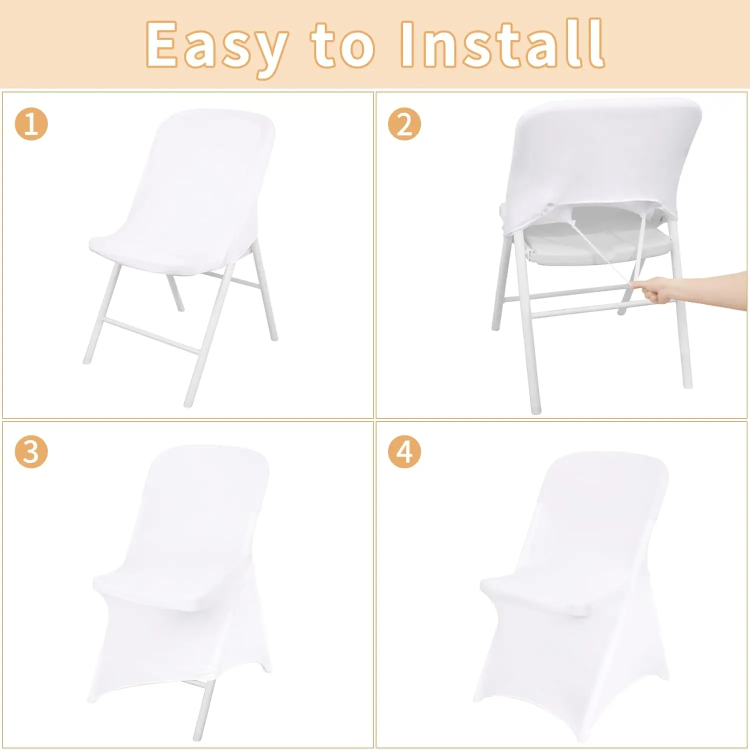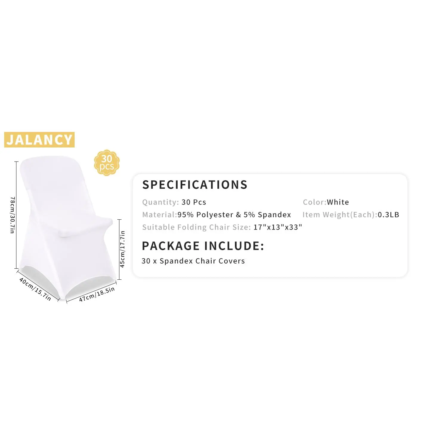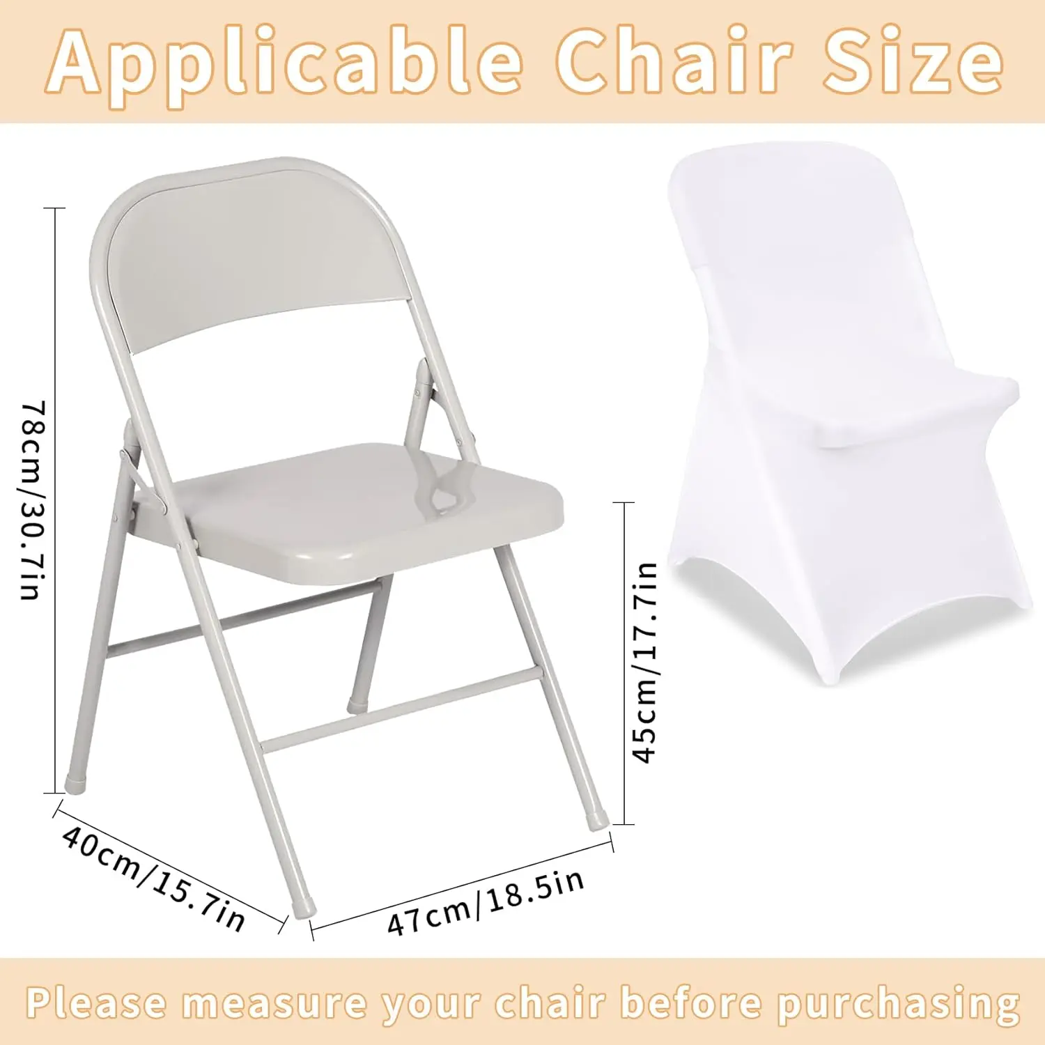 [What You Will Receive]The package includes 30 Pack four-way spandex folding chair covers (White, the chair is not included) . The stretch spandex folding chair cover suits for most 4 legs folding chairs. Chair width 12-20 inch (30.5-51cm), height 28-33inch (71-83cm).[Premium Quality] Made from high quality polyester-spandex blend, these spandex chair slipcovers offer a snug, wrinkle-free fit on most standard banquet chairs.The fabric is smooth, stretchy, and wrinkle resistant, ensuring a polished, elegant and more formal appearance.The material holds up well after washing without losing elasticity.[Snug Fit] They are spandex material and stretchy.Nice stretch to fit different sized chairs.The material is good and can be washed and reused.Easy to put on and fits well on those folding chairs.Washable, stretches well on the 4 legs.Ease to use , ease to assemble , easy to adjust , rip resistant, wrinkle resistant.[Great Decoration] These chair covers will transform your home dining experience, make the room look more festive and "fancy" even.The covers fit snugly, giving it a more formal appearance.There are different ways to dress up chairs from bows to fabric and flowers.Great for covering folding chairs to make them more presentable.[Wide Application]Great for a wedding, trade show vendor, jewelry display, tailgates, birthdays, bars, parties, outdoor activities, etc. These chair slipcovers look terrific and classy as part of the overall decorations. These add so much polish to a party room - they make everything look so decorated.