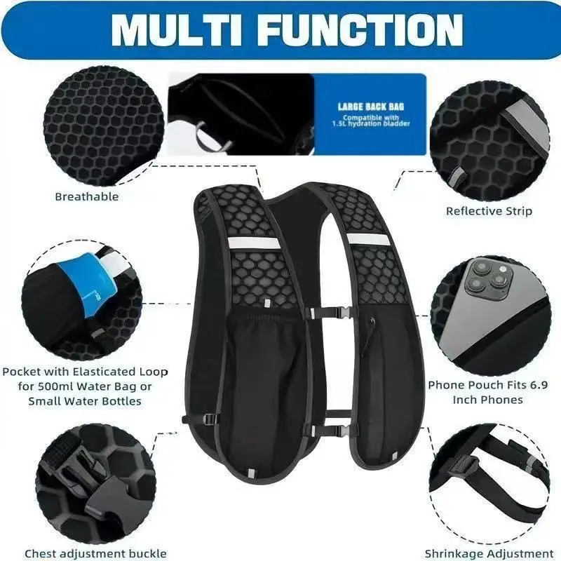Stay visible and organized with this versatile vest backpack. Perfect for cycling, running, and leisure activities, it combines functionality with safety. The vest is small yet spacious, ideal for carrying essentials. Its waterproof and breathable design ensures comfort in various weather conditions.