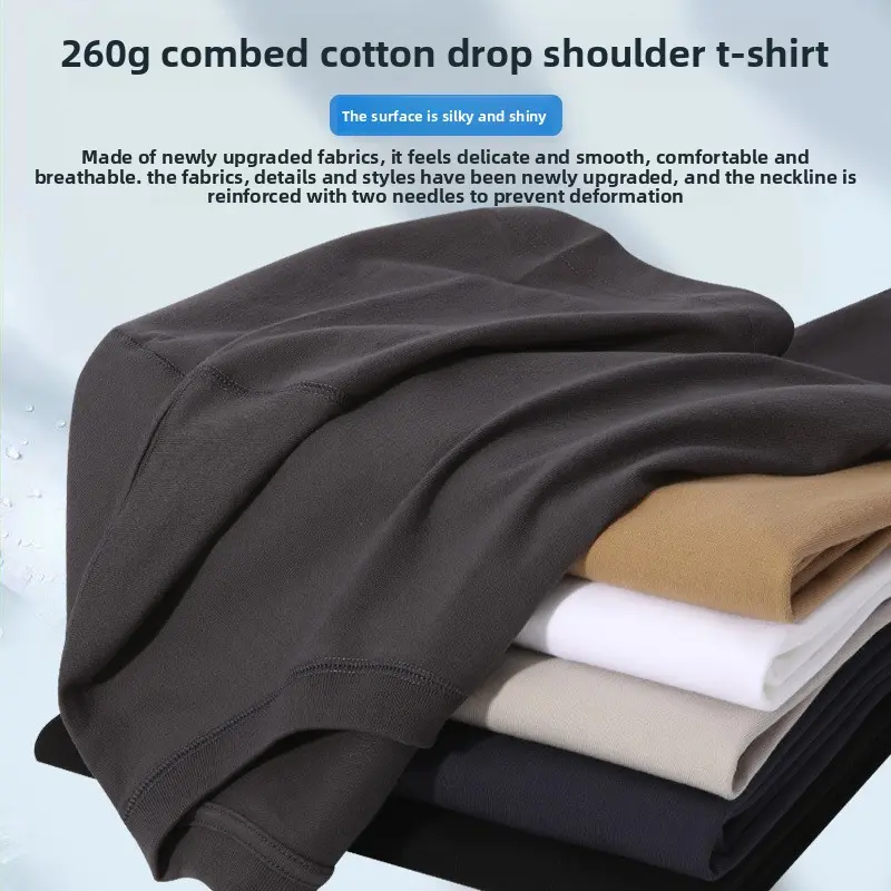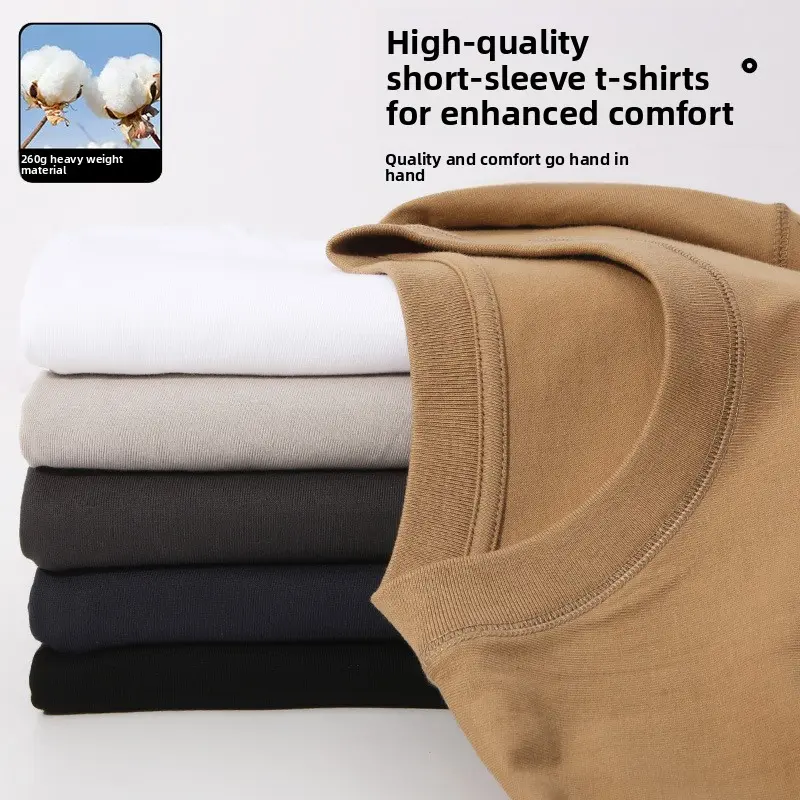 260g Combed Cotton Drop Shoulder T-Shirt For Men, Heavyweight Solid Color Crew Neck Short Sleeve Lightweight Top