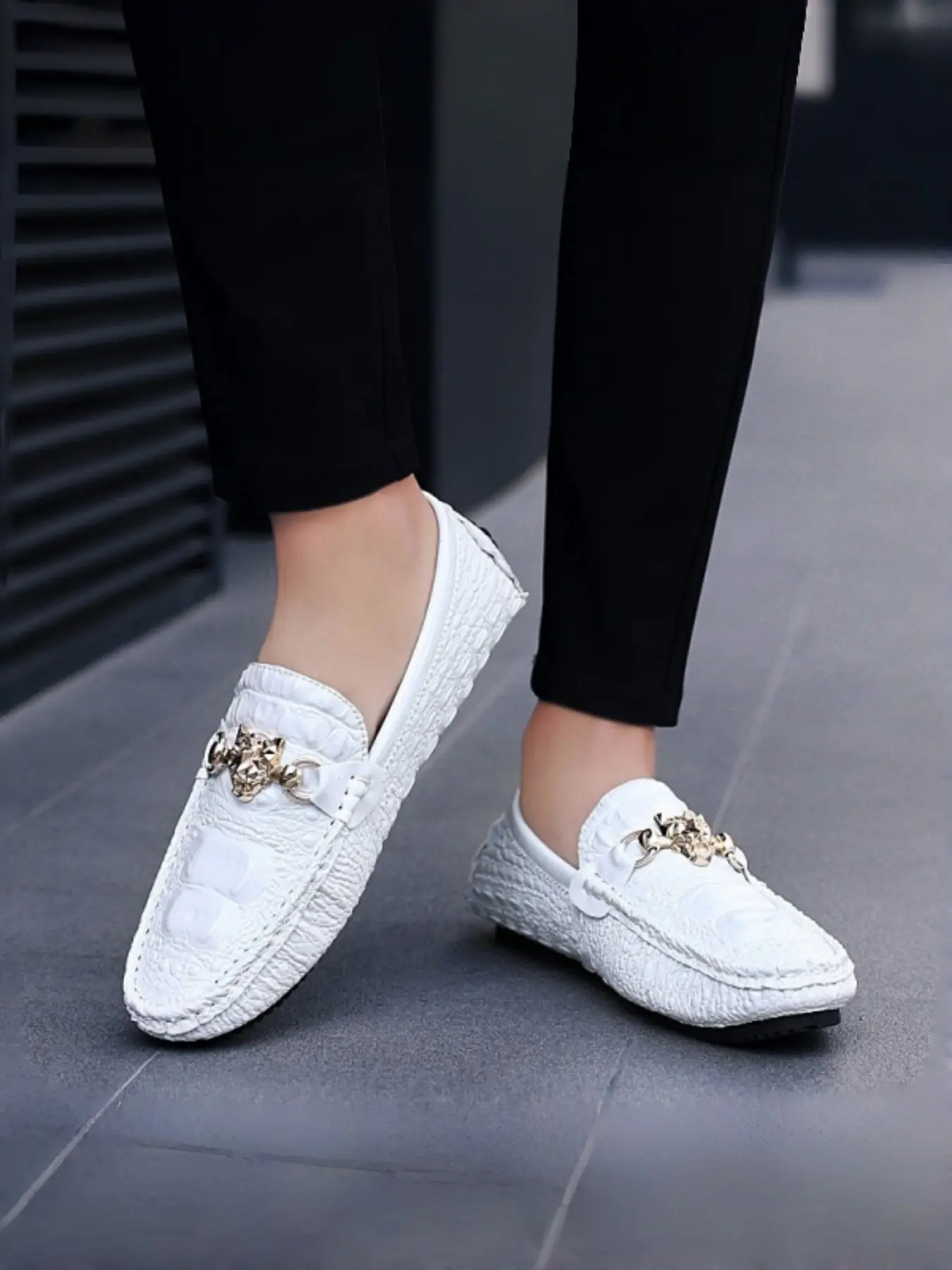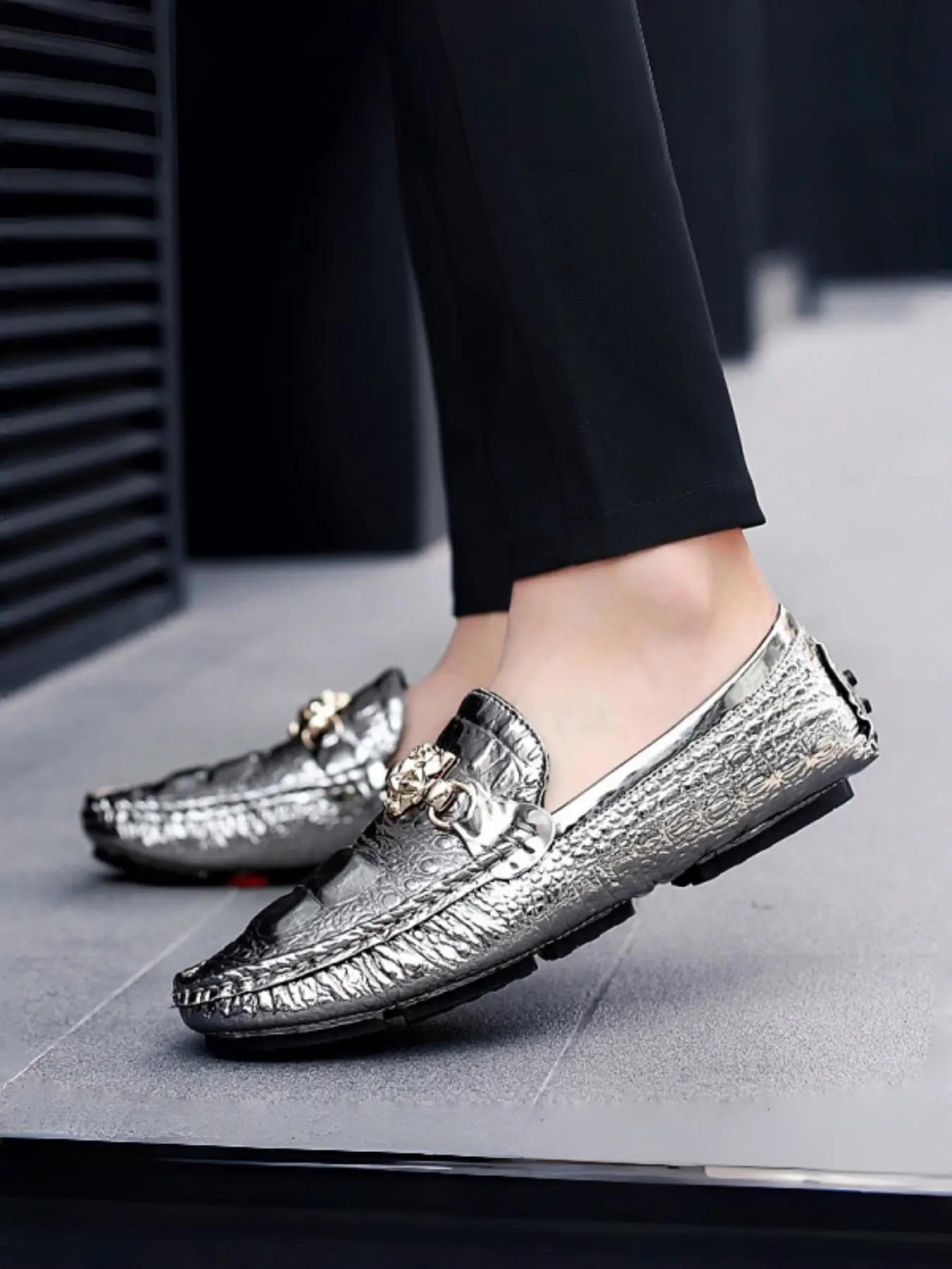 Men's Glossy Crocodile Texture Bean Shoes, Commuter & Fashionable Wear, Leather-Like Finish, Unique Metal Buckle Design