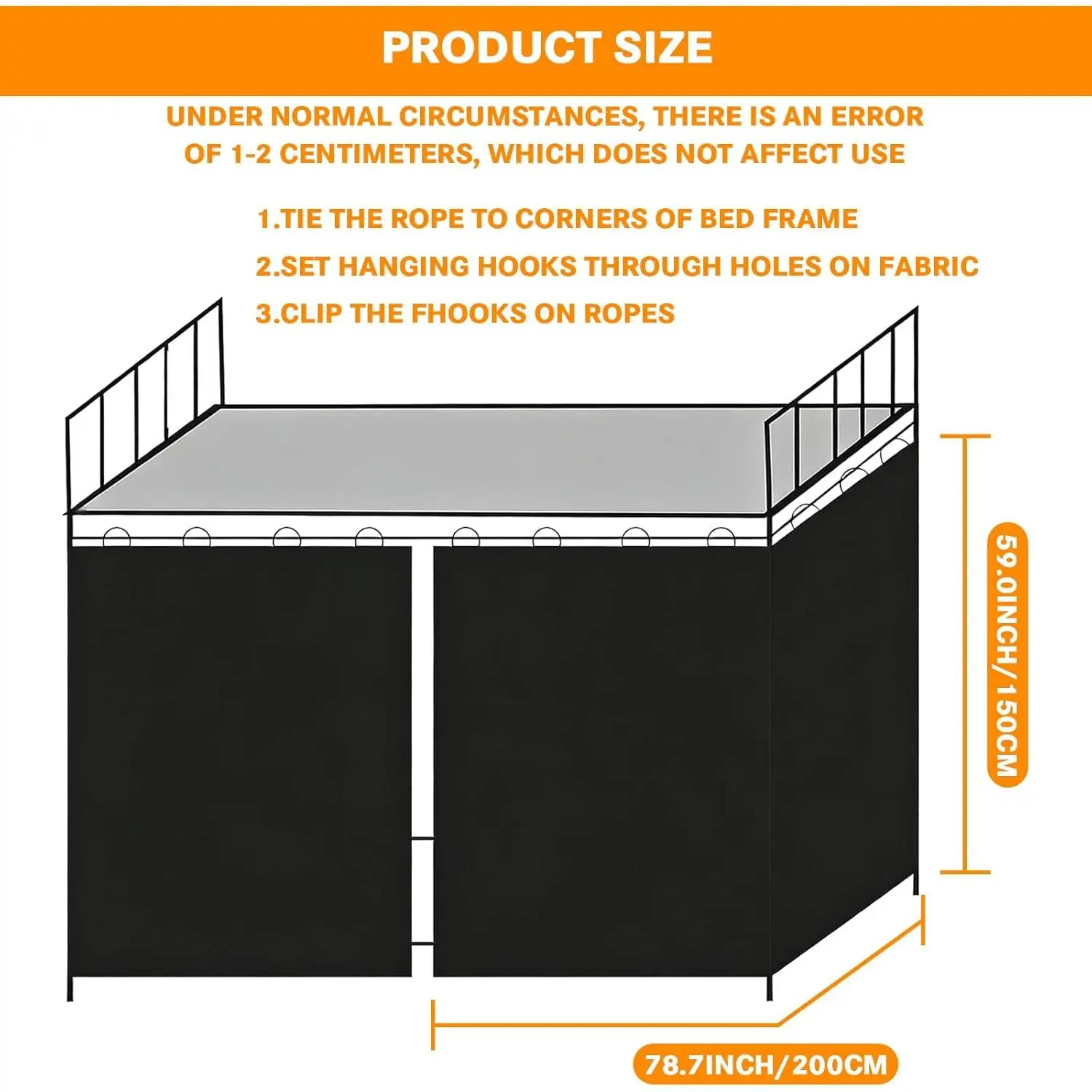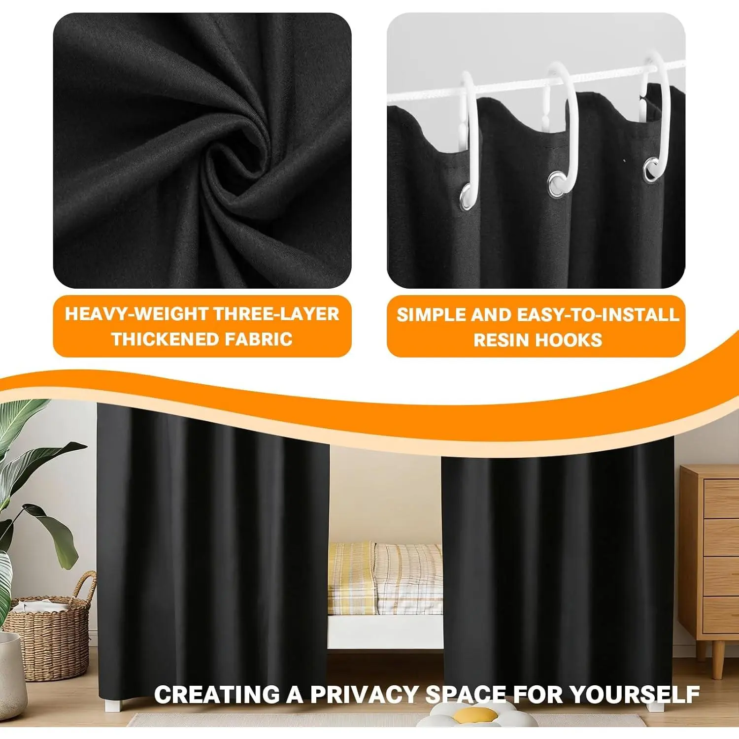 Premium Blackout Fabric: The dorm privacy bed curtain constructed from 100% thick, heavyweight triple-layer polyester blackout fabric.Features a glossy solid color on one side and a matte black blackout coating on the reverseeither side can be used as the exterior.The fabric is soft and breathe well, non-formaldehyde, soft, breathable, durable, and easy to wash, offering you comfortable use experience.Superior Light Blocking: The bunk bed curtains specially added black coating blocks 95%-99% of light, surpassing ordinary curtains, to create an ideal dark sleeping environment.The thick material also helps protect against mosquito bites for healthier, undisturbed sleep, perfect for night workers or light-sensitive sleepers.Enhanced Privacy & Personal Space: The bunk bed curtains for bottom will effectively separates your bed from the surrounding area, creating a private, personal mini-room within dormitories or shared spaces, shielding you from view and protecting your privacy.Product Size: Each panel bunk bed curtain measures 78.7"L x 59"H (200 x 150 cm).Suitable for beds measuring 78.7"L x 39.3"W (2 x 1 m) or smaller.Please note that if you use the bed curtains for the top bunk, you need to prepare the bed curtain holder by yourself.2-Piece Set for Easy Installation:Bunkbed curtains comes with 2 curtains (each 2m*1.5m) for flexible coverage with metal grommets, hooks, and ropes for straightforward setup and removal.simple to install on dorm bed frames, saving your time.Perfect for Dorms & Loft Beds: Designed for both top and bottom bunks, these dorm bed curtains fit most standard college dorm beds, loft beds, and single sleeper setups.Easy to install with hooks or ties.