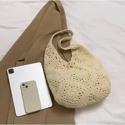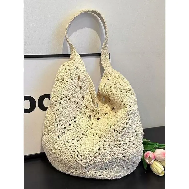 Versatile single-shoulder straw bag for women, high-end handmade cotton woven bag, large-capacity beach vacation tote bag
