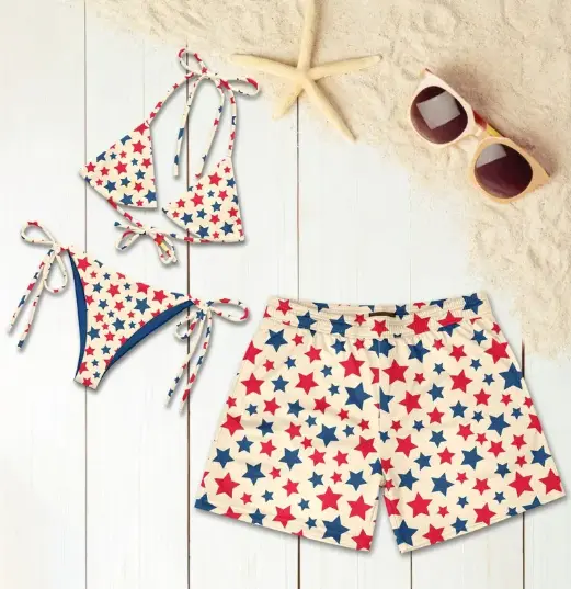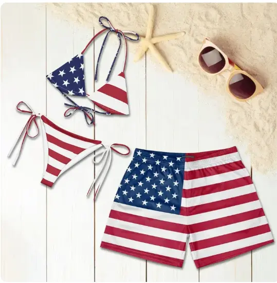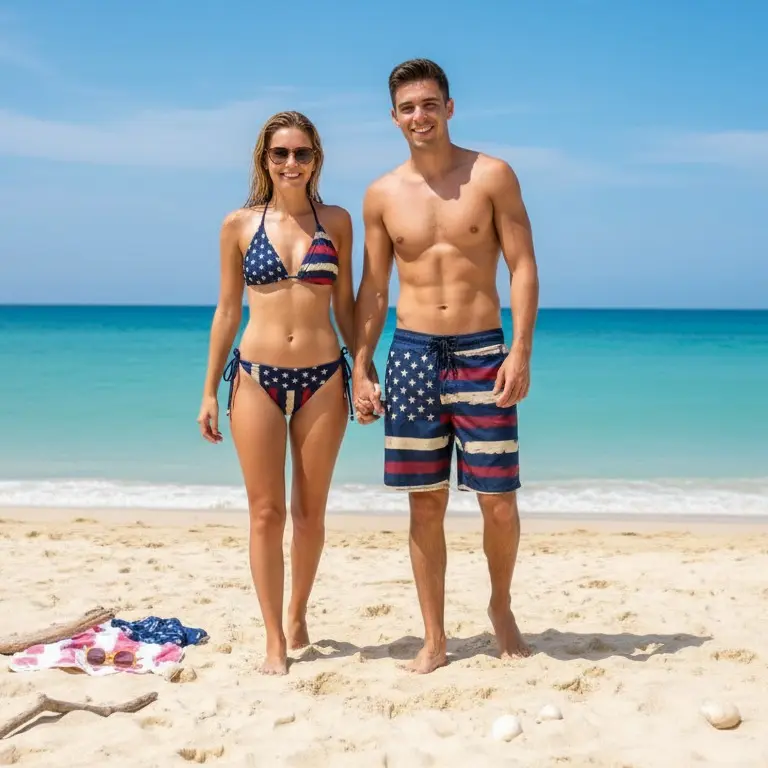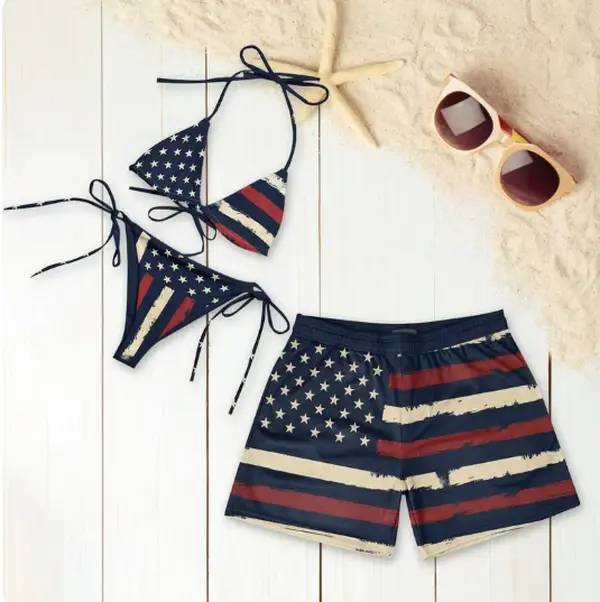 This set features a women’s tie-side thong bikini and a men’s beach shorts. Perfect for summer vacations, it’s a matching outfit for couples. The American flag design adds a festive touch. Ideal for sunny days by the sea, it ensures you look and feel great. Enjoy your summer with this stylish and practical beachwear.