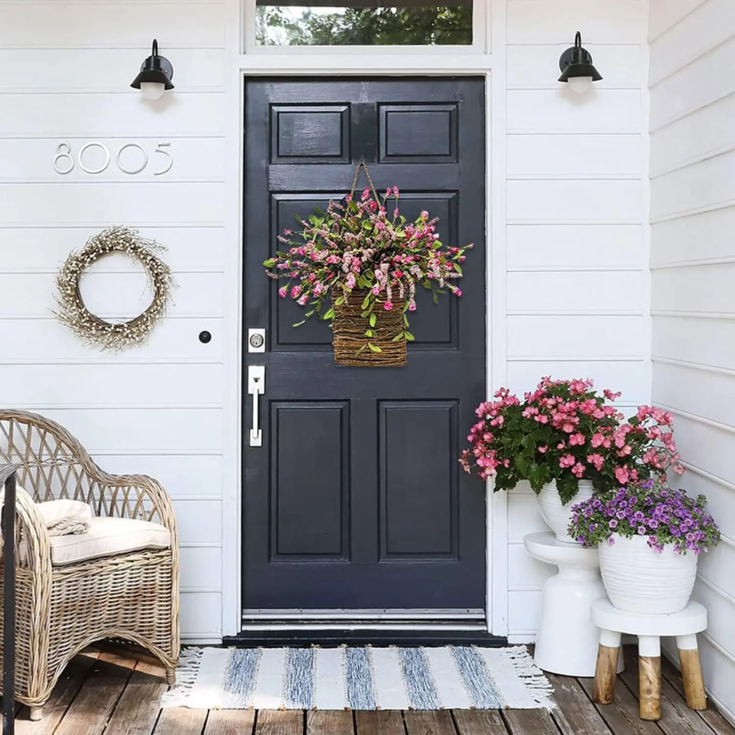 Enhance your home decor with this gorgeous Pink Berry & Wildflower door hanging basket! Perfect for weddings, parties, birthdays, or everyday use, this wildflower basket adds a touch of natural beauty to any setting. Its vibrant pink berries and lush greenery create a fresh, inviting look. Hang it on your front door or indoors for a pop of color.