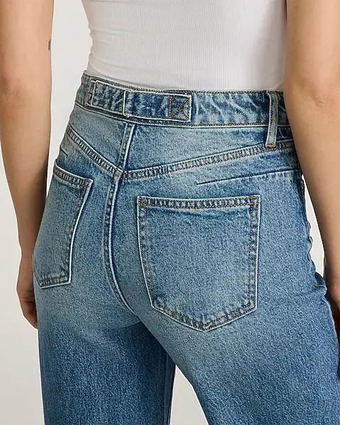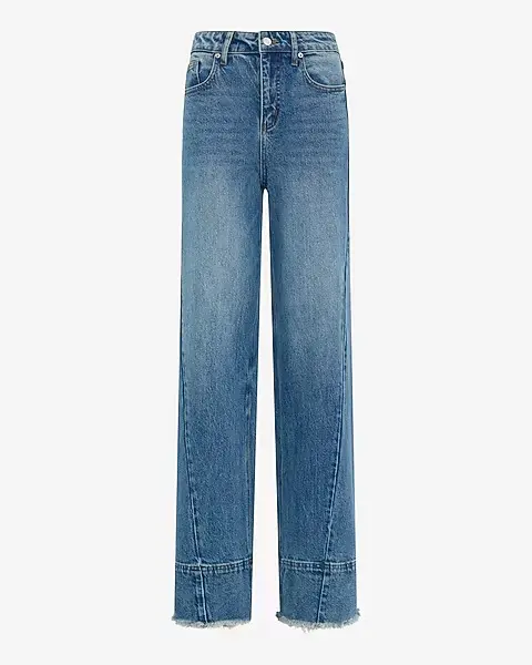Sitting at a high rise and fitted look through the waist and hip, this medium wash wide leg is designed to fall straight down from the hip to give a long and lean appearance. Crafted in low stretch thats equal parts comfort and vintage feel and with a tall distressed hem.