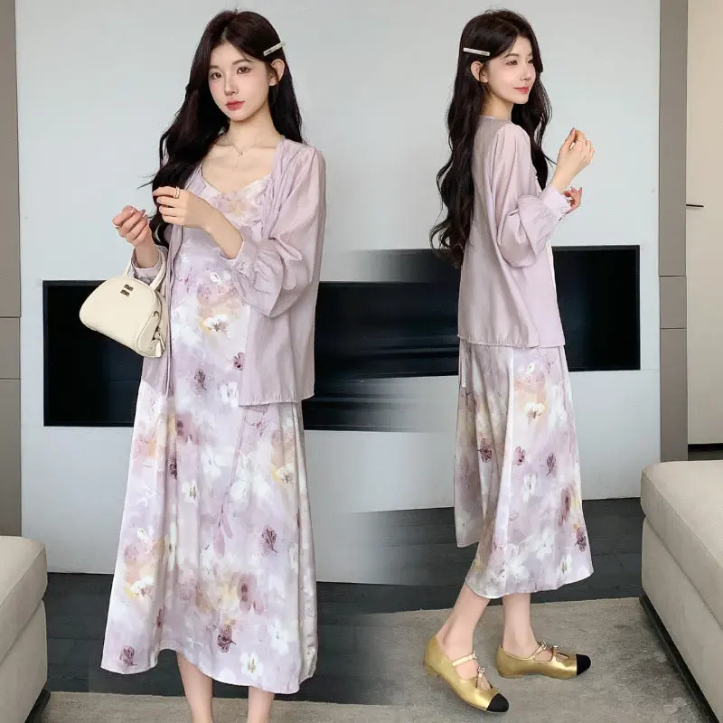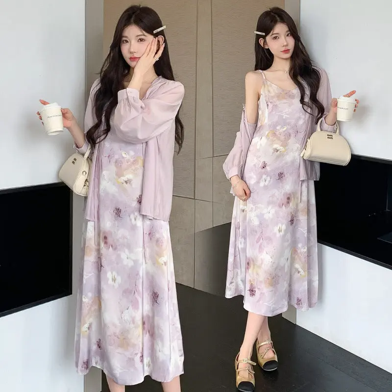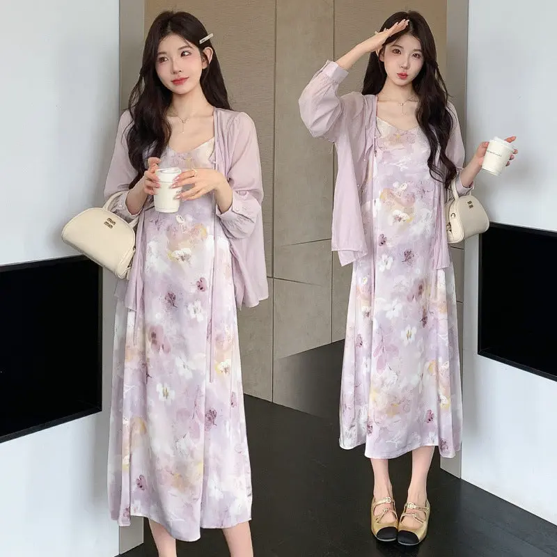 Sweet And Gentle Style Purple Printed Slip Dress Shirt And Cardigan Two-Piece Set