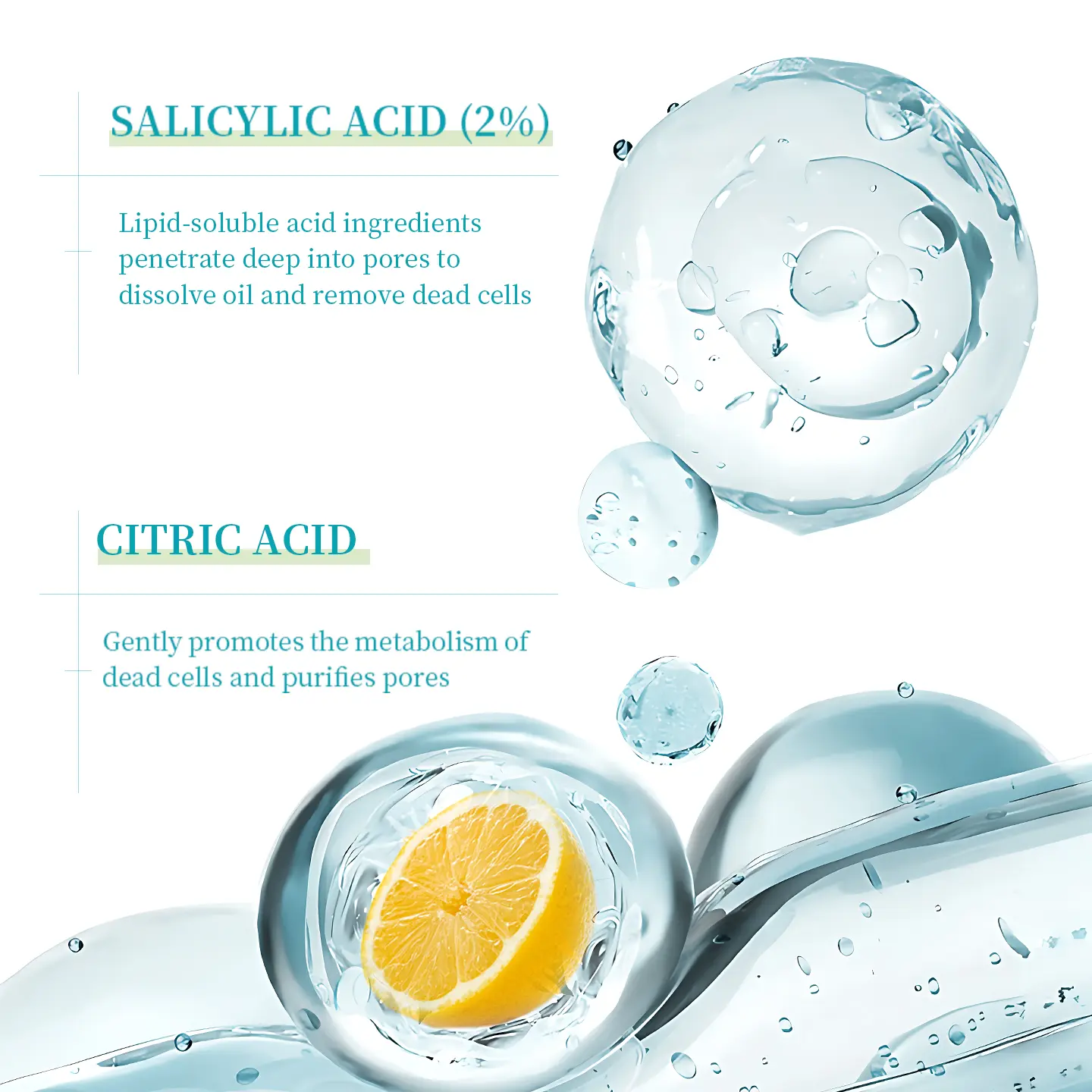 ·Pore-Refining Exfoliation: 2% salicylic acid helps clear excess oil and dead skin buildup from pores, refining the look of congested, uneven skin texture.