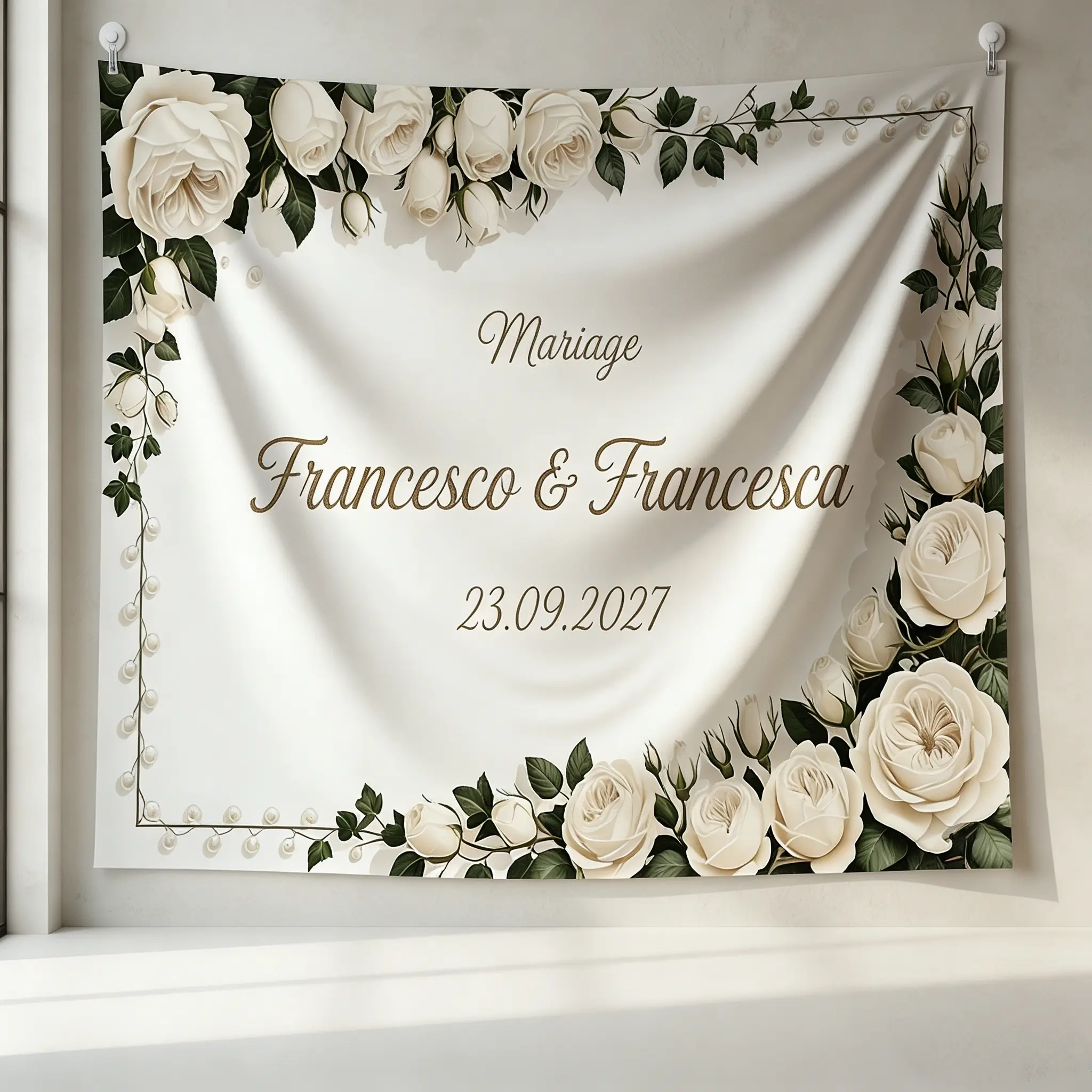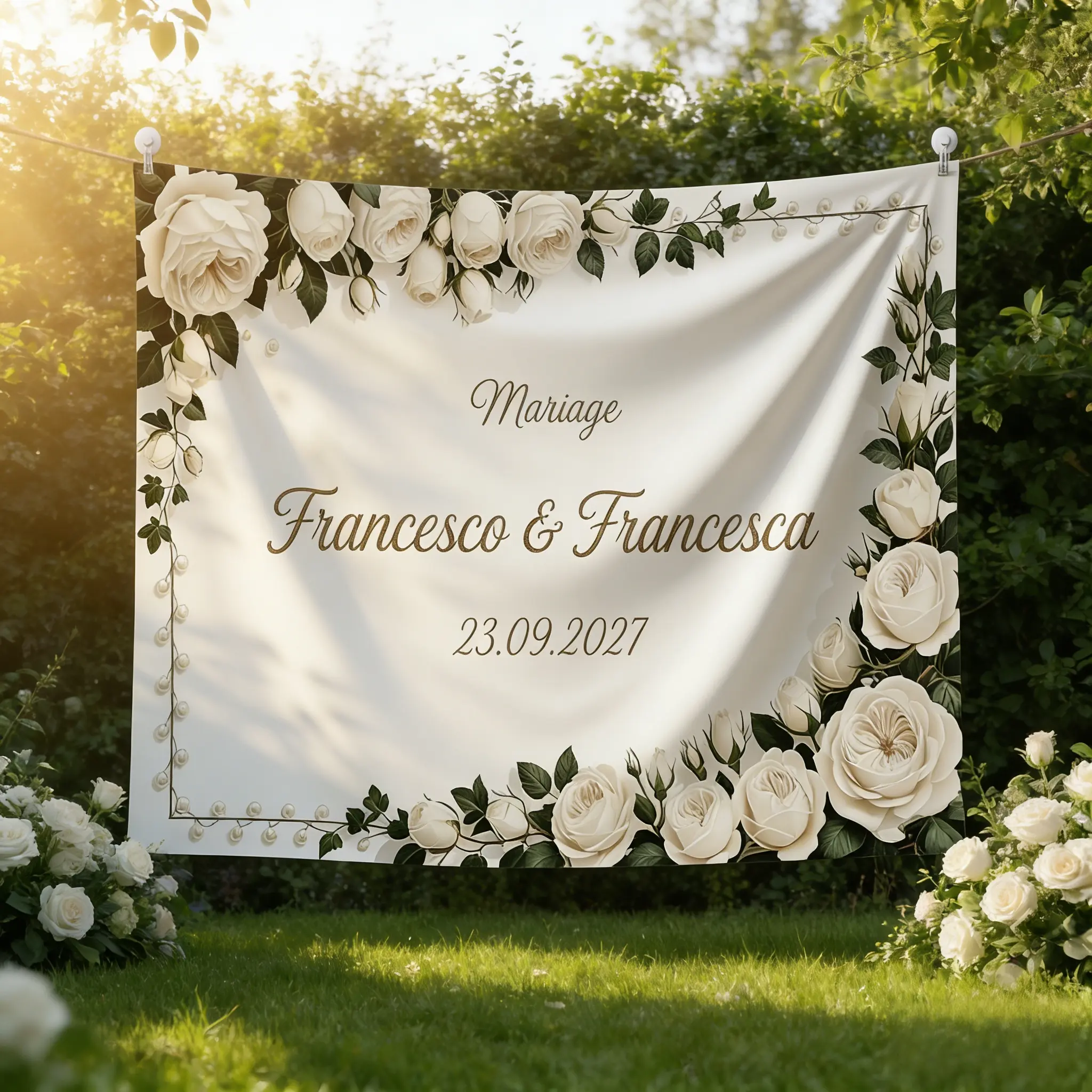 This 2D Flat Banner is perfect for weddings, birthdays, baptisms, first communions, and quinceañeras. It features an elegant floral design with customizable names and dates. Ideal for creating a memorable backdrop for any special occasion. The banner is large and personalized, making it a standout piece for your event.