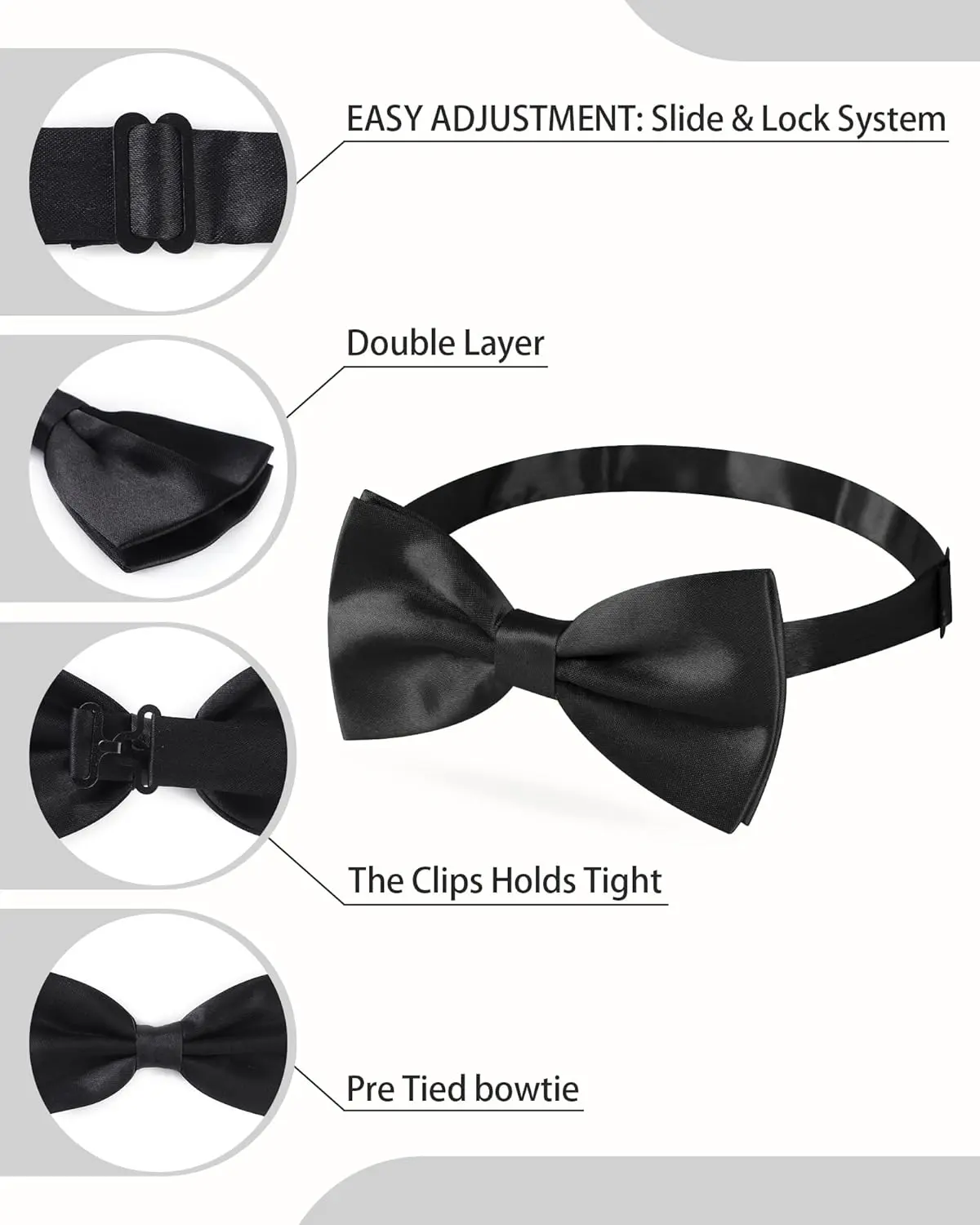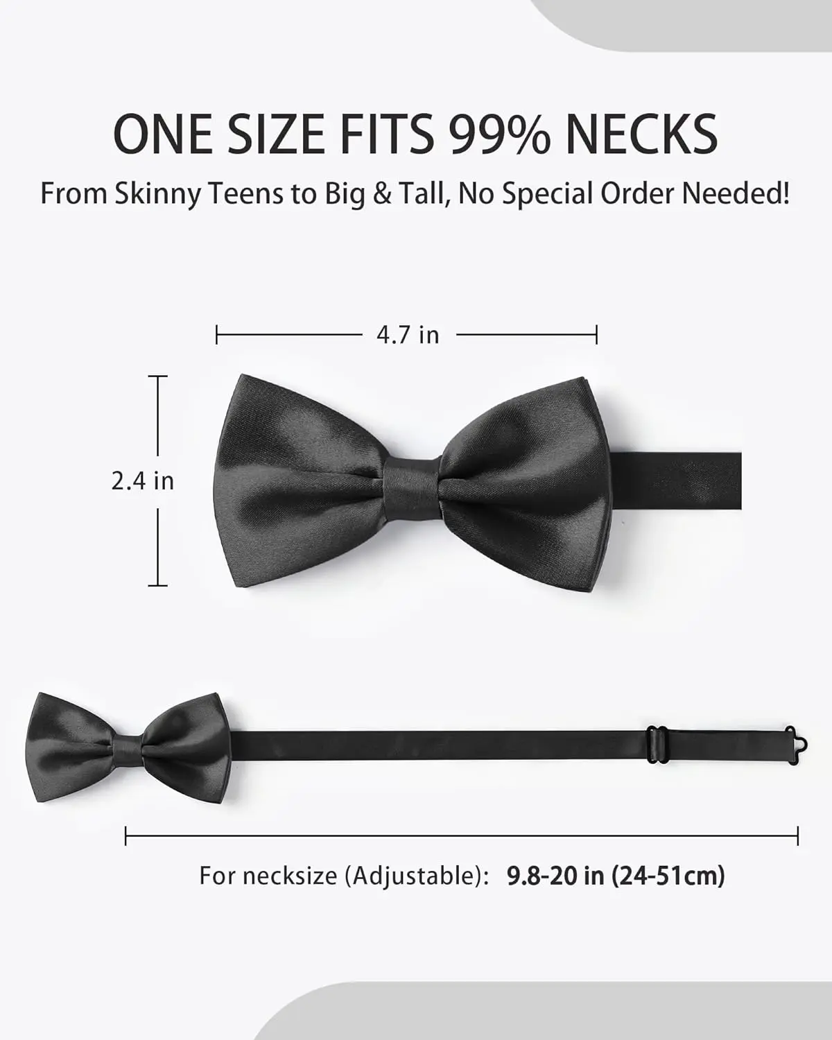 ·High Quality : Bow tie use solid satin finished polyester, the satin material bears the elegant look of silk, giving the bow tie a high-quality look that belies its affordable price.