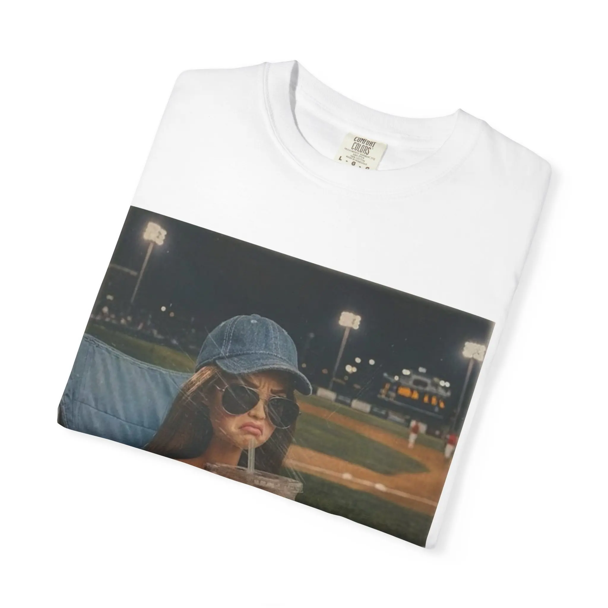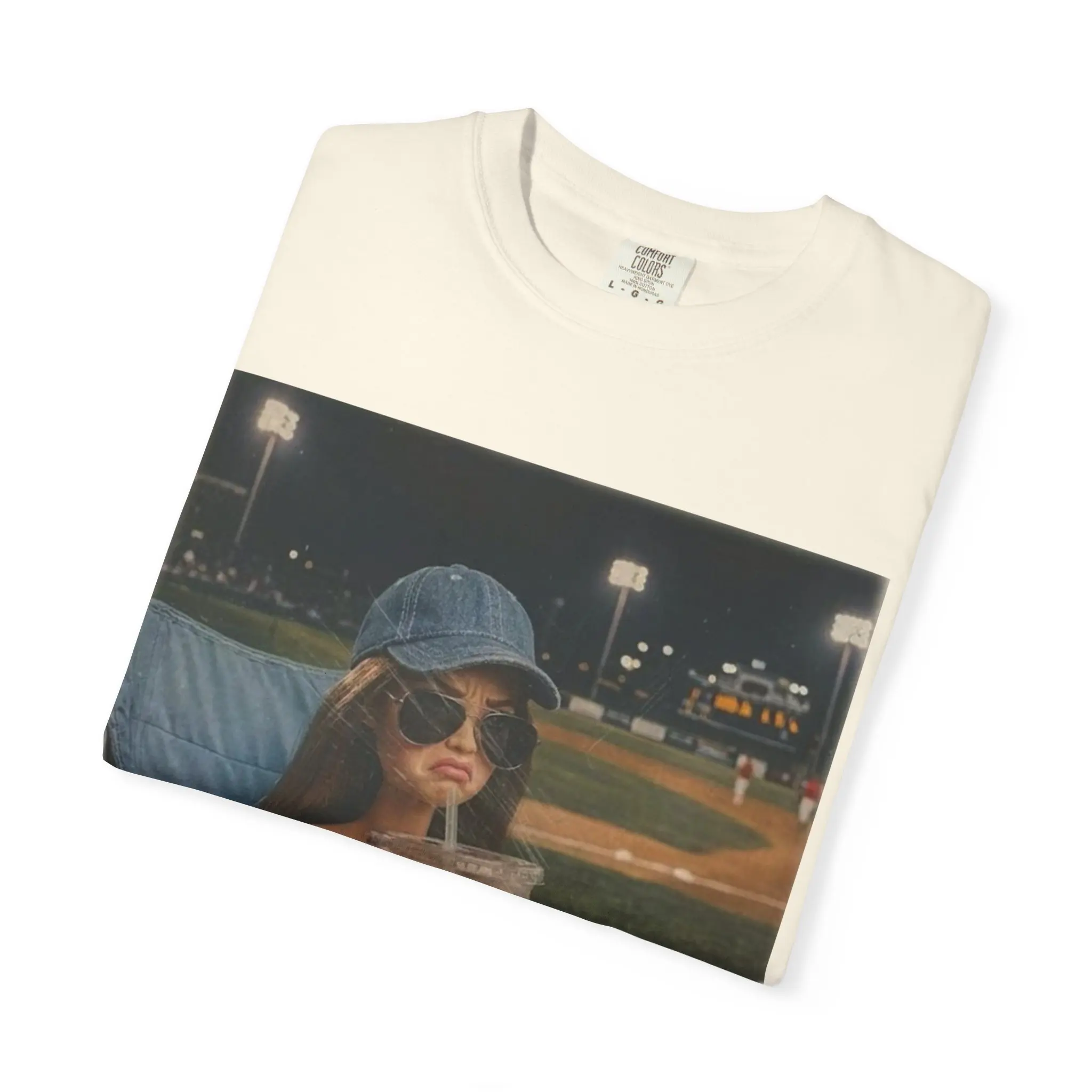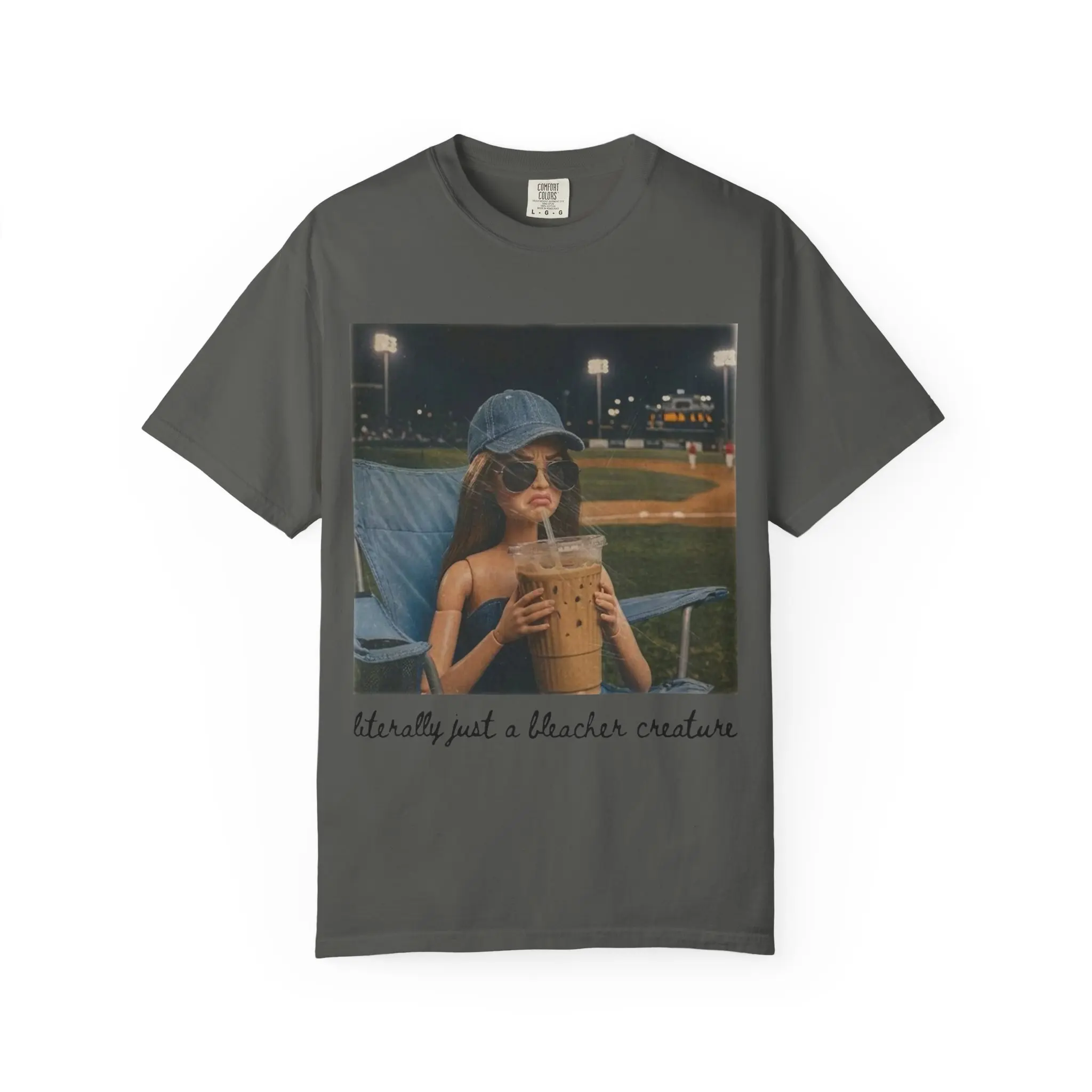 This relaxed, garment-dyed tee carries a nostalgic, sunlit vibe — the kind of shirt you reach for when you want to feel casual and put-together at the same time. The front print shows a candid stadium moment: a young woman in a baseball cap sipping iced coffee under the lights with a handwritten caption that reads “literally just a bleacher creature.” It reads like a small, private memory on soft cotton. Wear it to evening games, weekend coffee runs, or whenever you want to channel easy confidence and low-key summer nights. The heavyweight knit, relaxed cut, and softened, post-dye finish give this shirt a lived-in feel that softens with every wash.