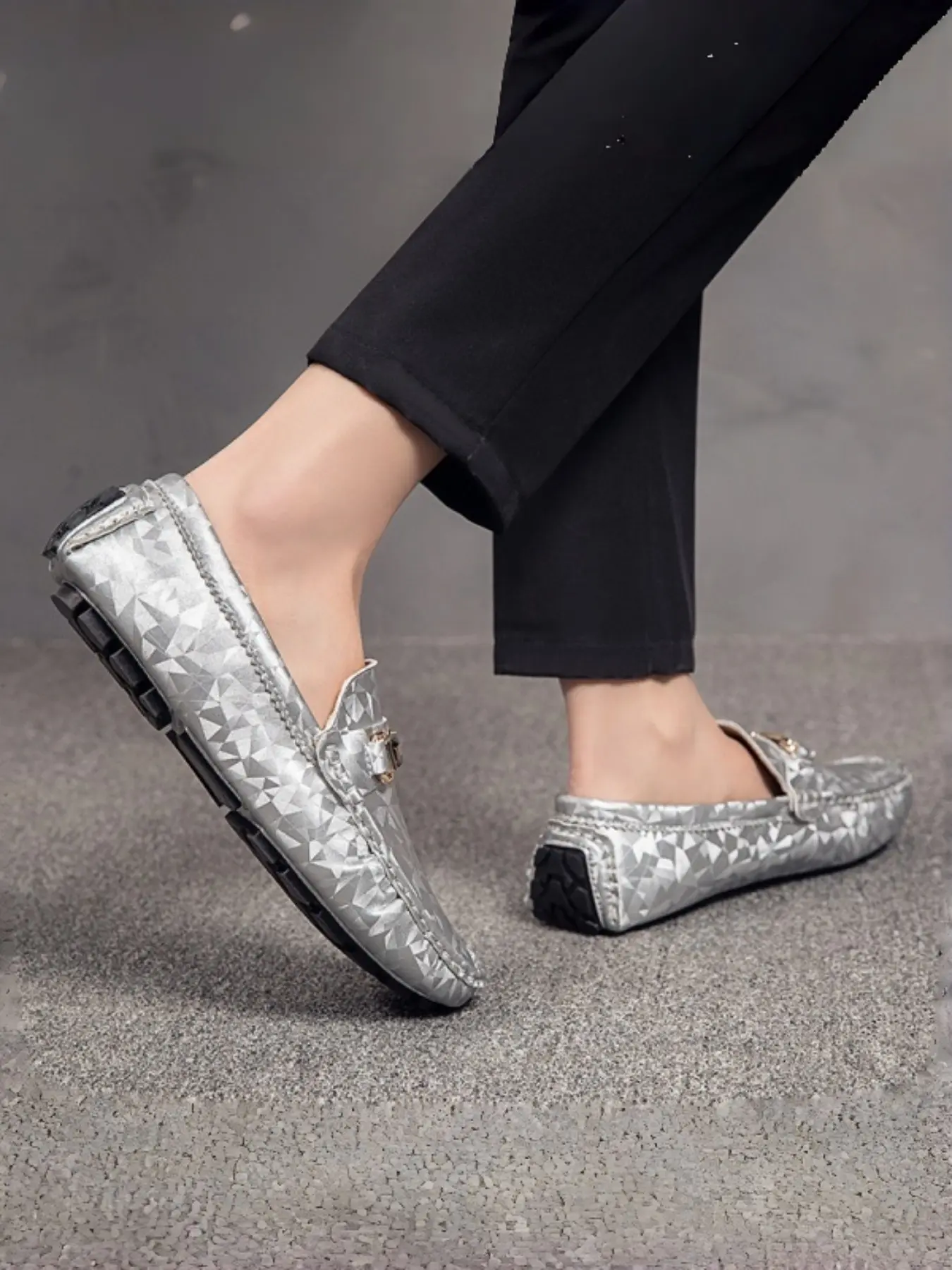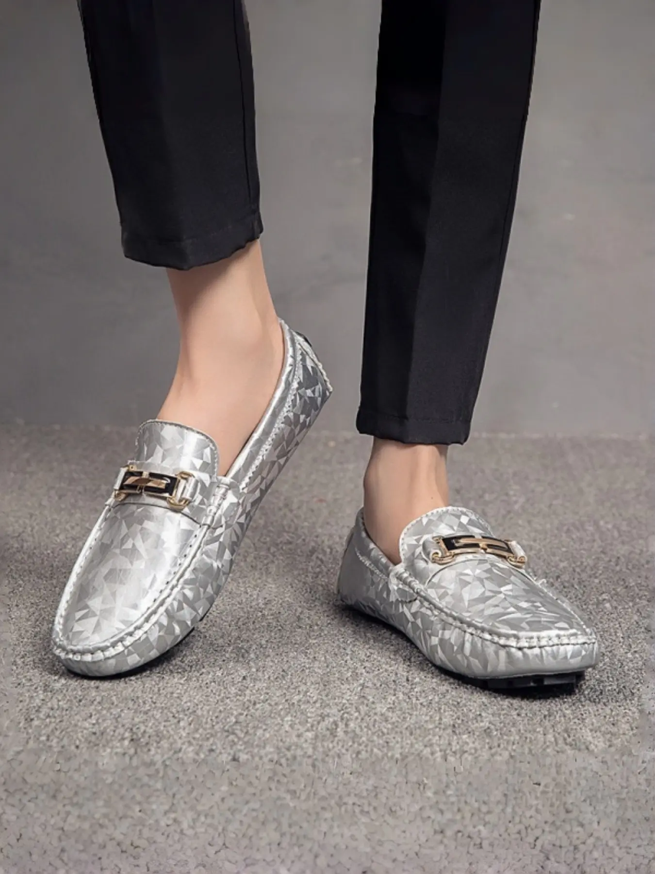 Men's Plaid Buckle Loafers, Daily Commute/style, Glossy Embossed Texture, Metallic Decorative Buckles, Trendy Casual Shoes