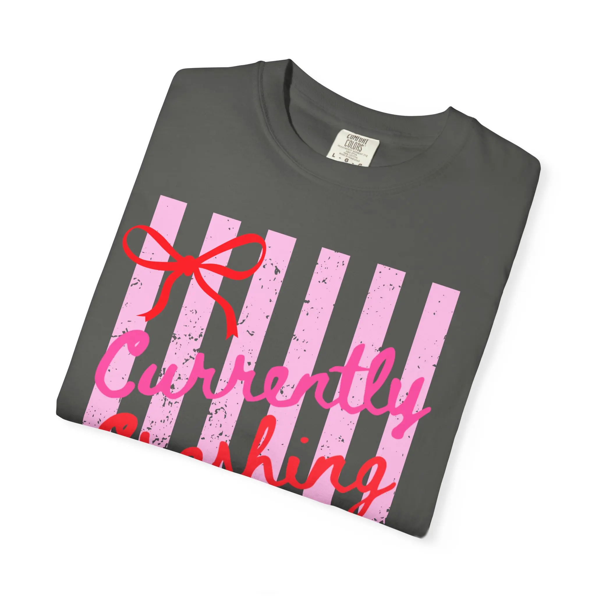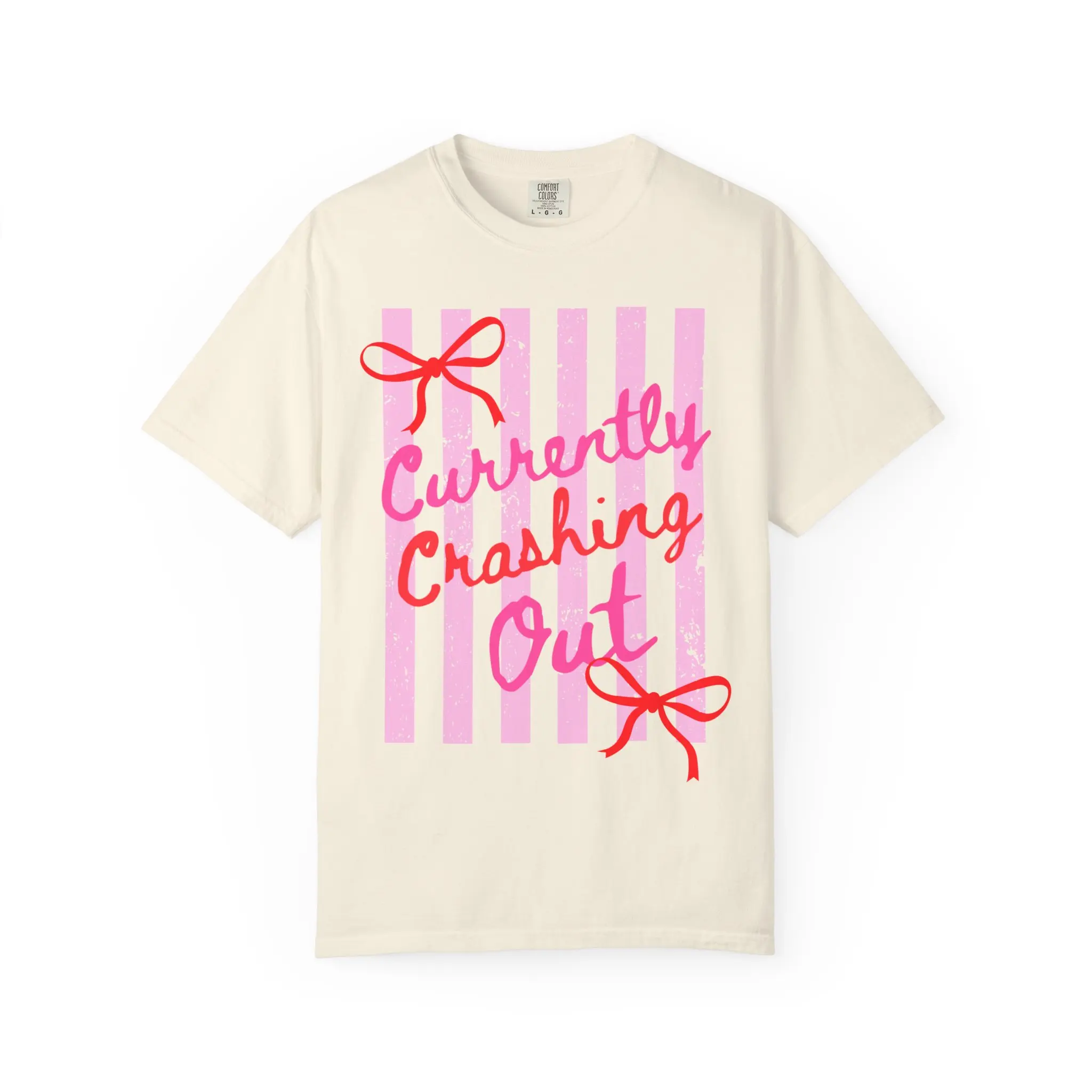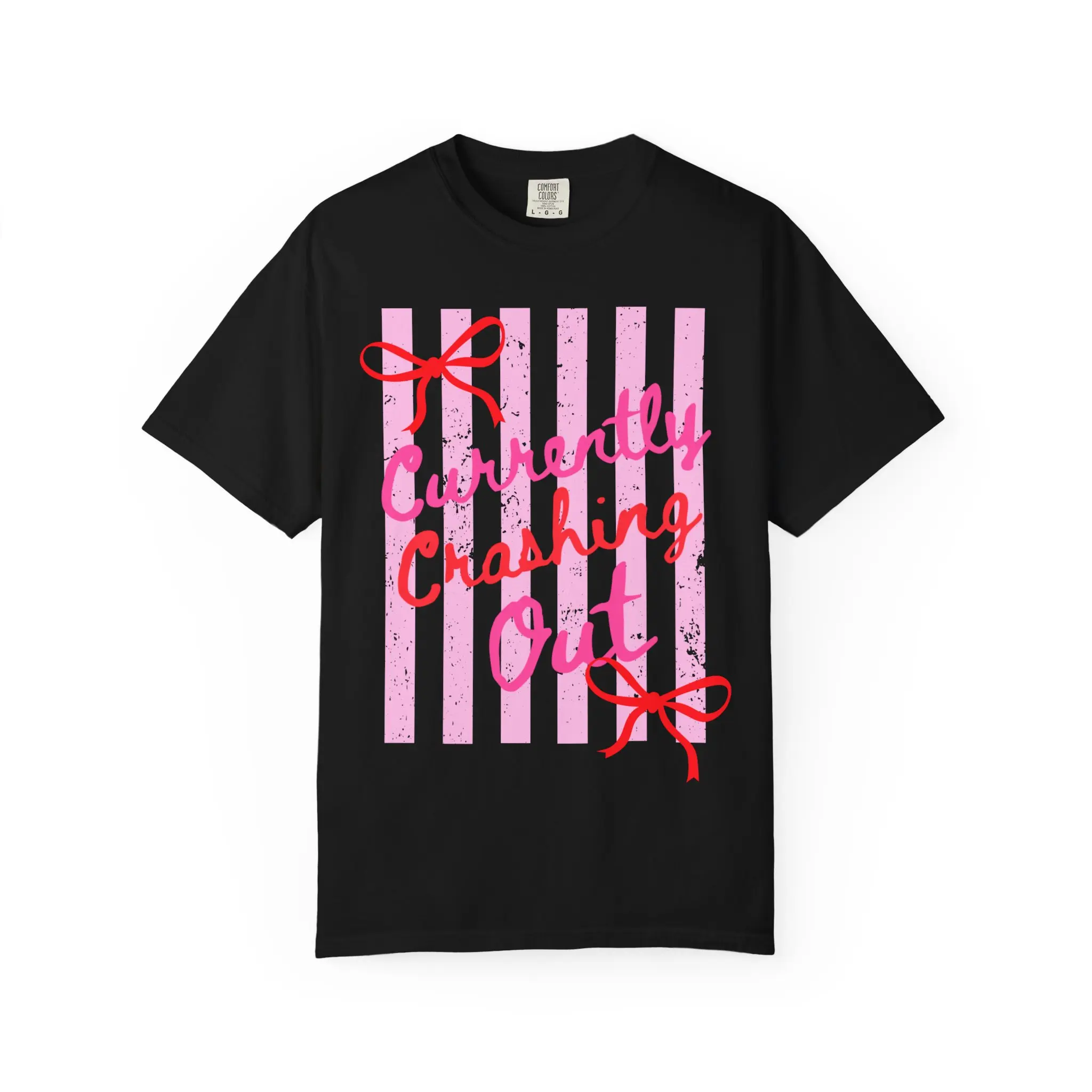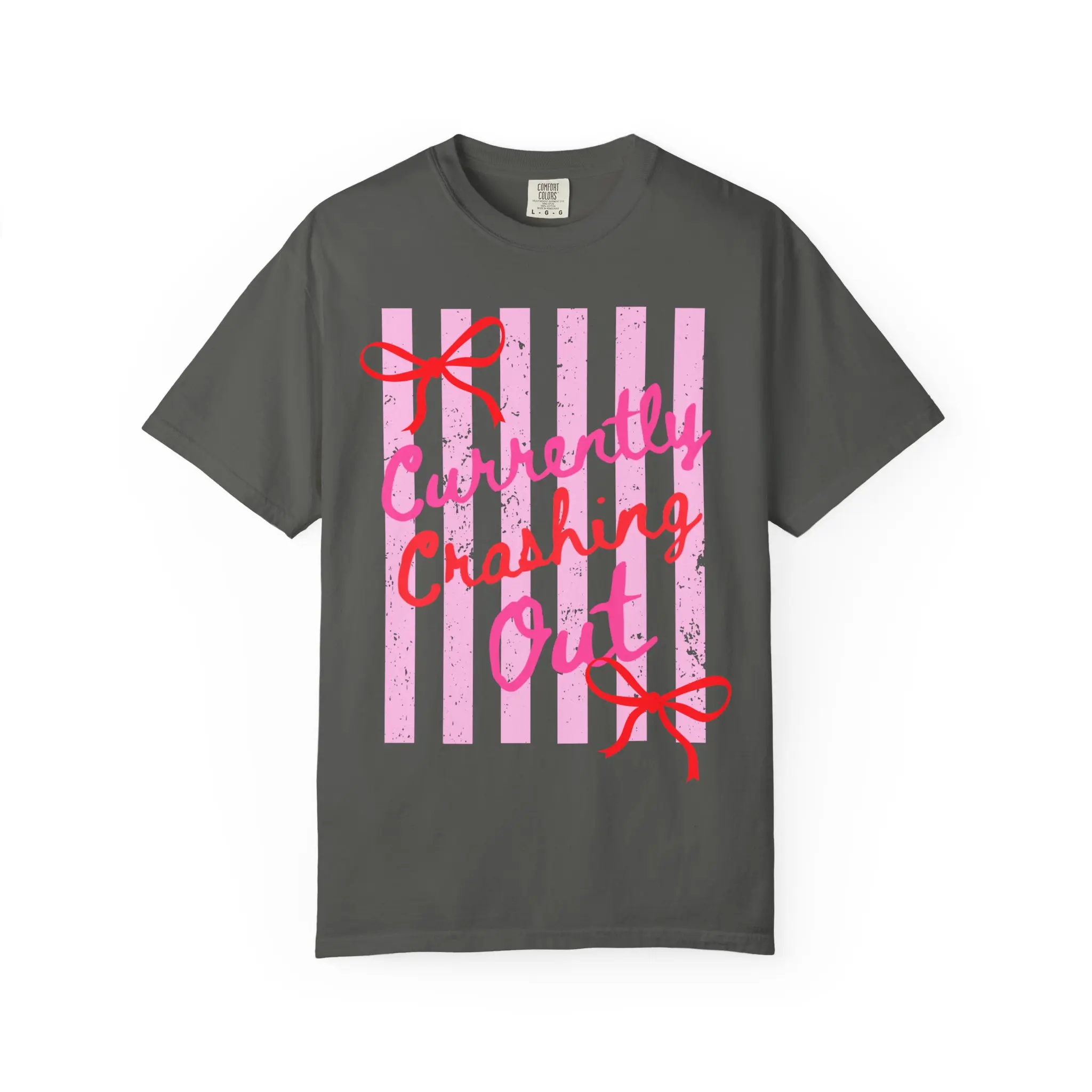 This lightweight-yet-substantial tee brings playful confidence to everyday wear. Soft, garment-dyed cotton gives the shirt a lived-in feel and gentle vintage tones that let the pink striped graphic and cursive “Currently Crashing Out” lettering pop without shouting. Relaxed cut and heavyweight 6.1 oz fabric drape comfortably over layers or stand alone as a statement piece — the sewn-in label and double-needle seams mean it holds its shape through repeated wear. Wear it around town, on late-night runs with friends, or lounging at home when you want a cheeky, nostalgic touch to your outfit.