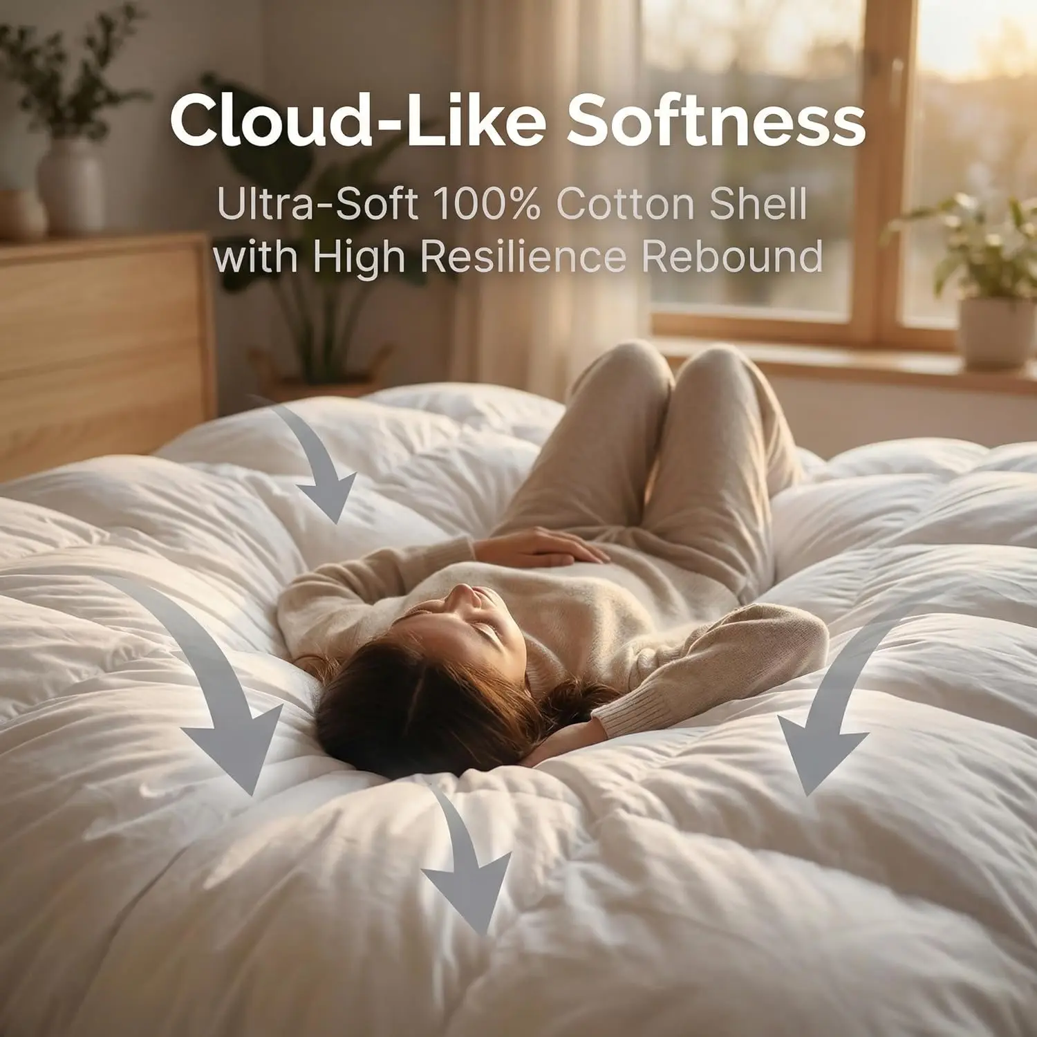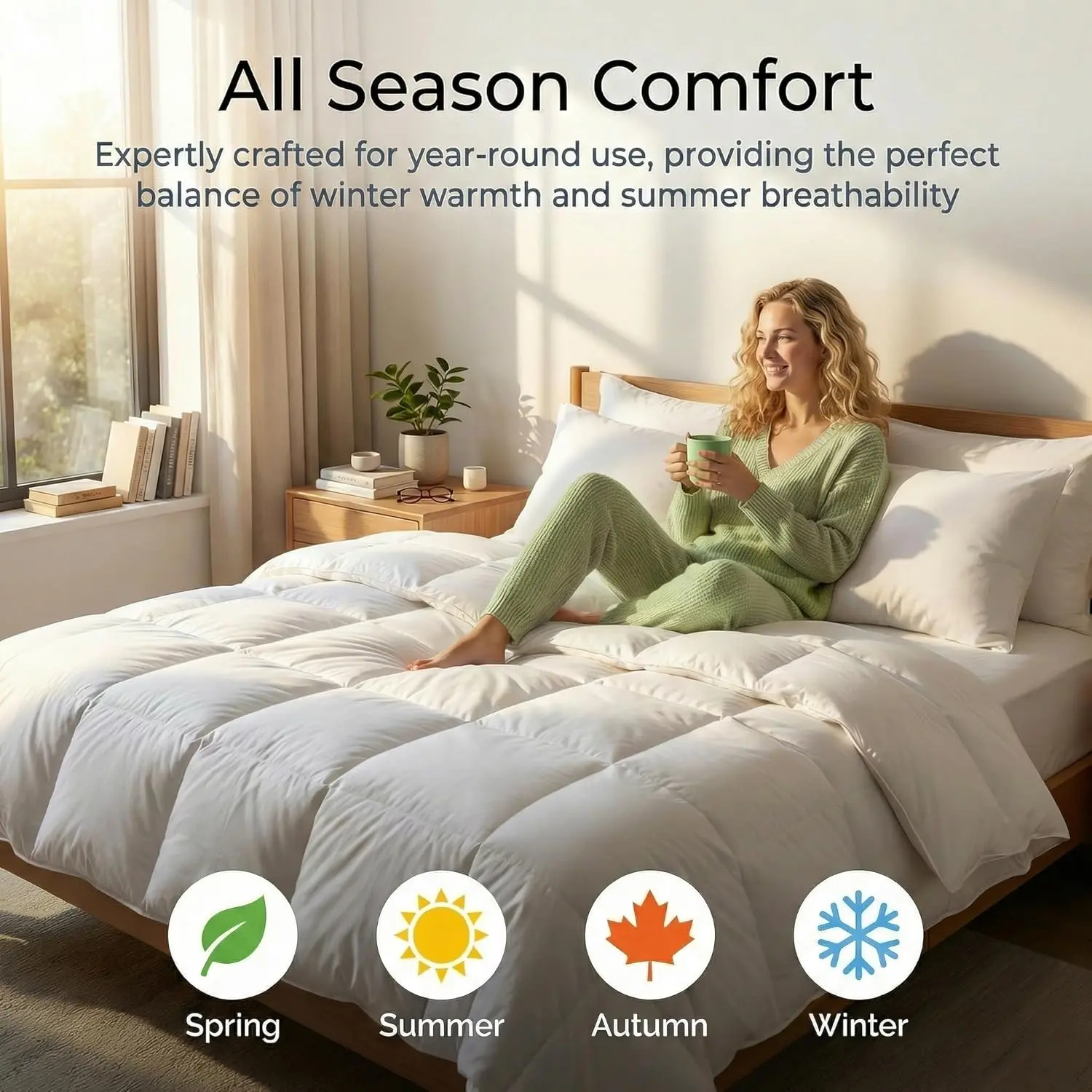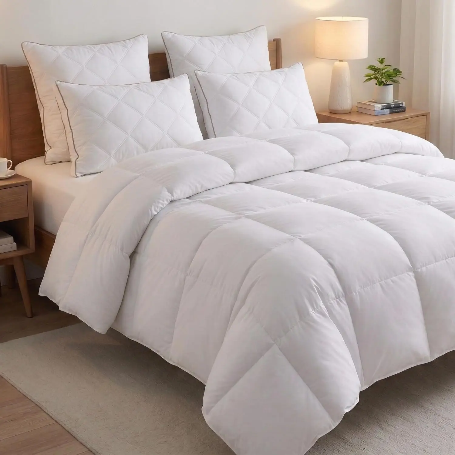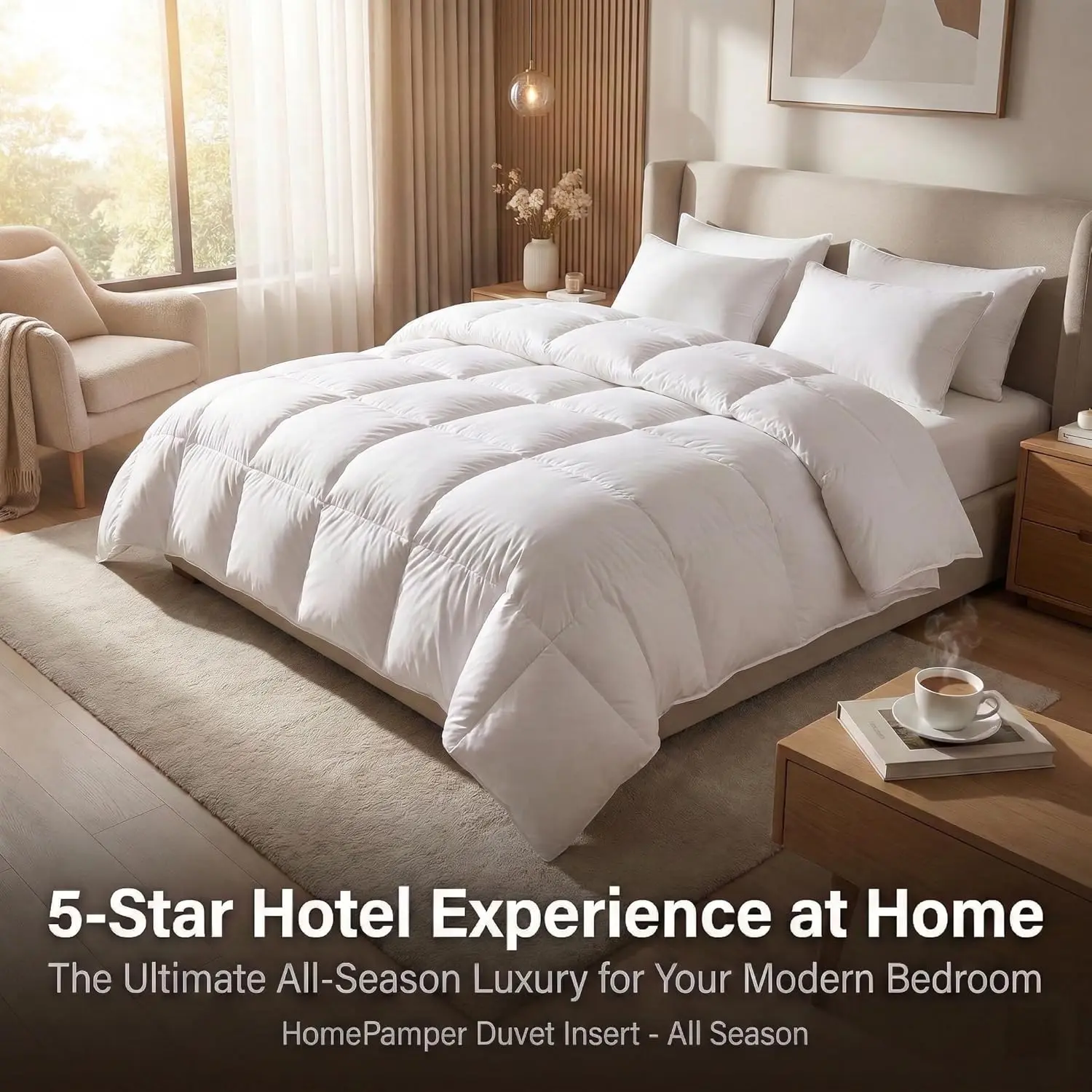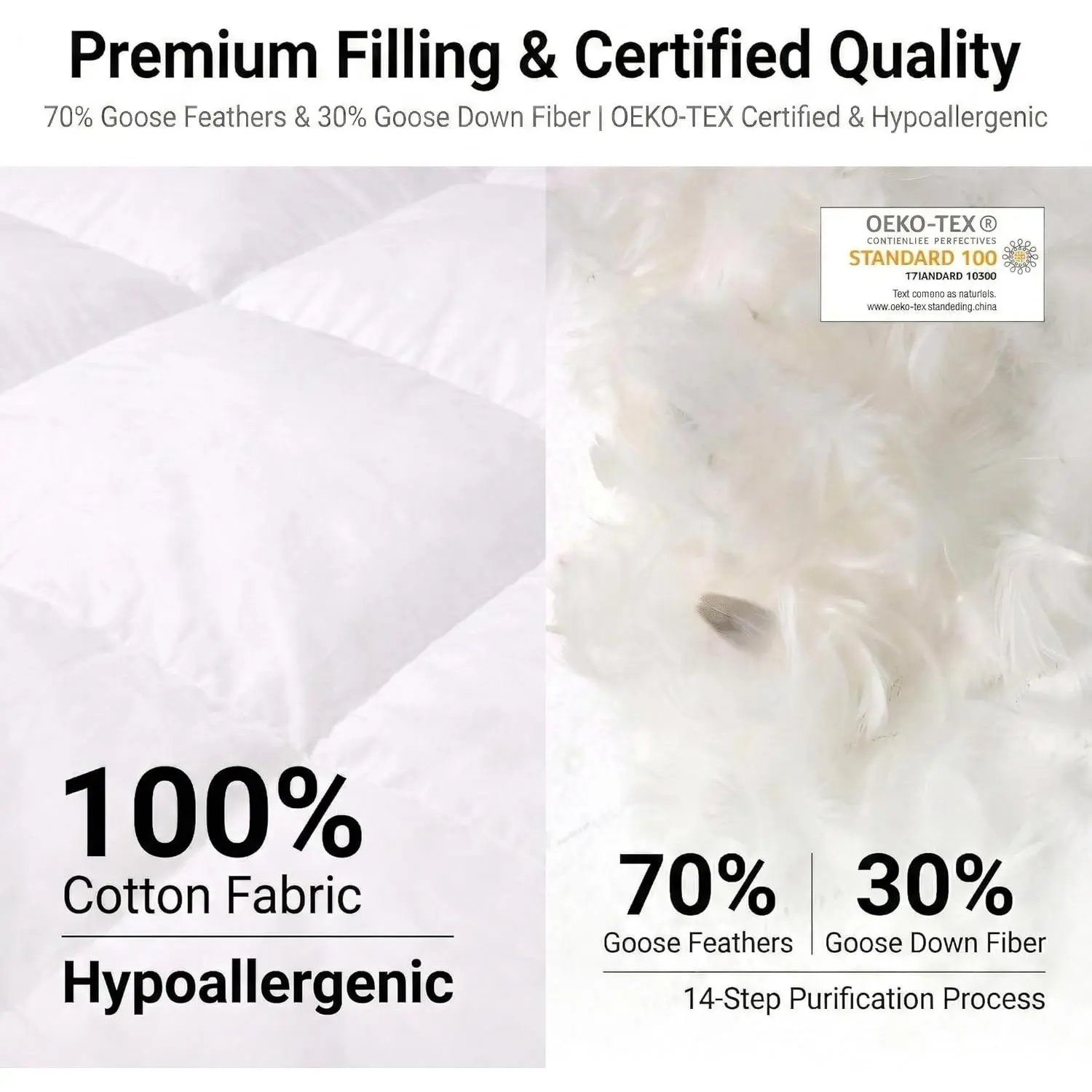[THE PAMPERING EXPERIENCE] - Indulge in the luxurious comfort of HomePamper.Our Queen size (90x90") comforter is generously filled with 50oz of premium natural goose feather blend, providing a cloud-like "Heavier" feel that keeps you cozy all night long.[NATURAL COTTON COMFORT] - Encased in a 100% high-density, down-proof cotton shell, this duvet insert is designed to balance thickness and breathability.The crisp, hotel-quality cotton fabric features a double-layered design to minimize feather pricks, reduce shifting, and prevent overheating, ensuring a dry, snug, and peaceful sleep environment.[TRUSTED HOME QUALITY] - At HomePamper, we prioritize your comfort.Featuring an OEKO-TEX Standard 100 certified shell (if applicable for fabric) and expert baffle-box construction, our comforter ensures the filling stays evenly distributed for consistent warmth.[DURABLE & SECURE] - Built to last with double-needle stitching and elegant piping.Equipped with 8 convenient corner tabs to anchor your duvet cover perfectly.It’s the ideal choice for those who love the classic, plush hotel bedding look.[CARE, REFRESH & NATURAL FEATURES] - PLEASE NOTE: We use premium, unbleached natural goose feathers for our filling.Because our 100% cotton shell is highly breathable and white, you may occasionally see natural dark or grey feathers through the fabric.This is completely normal and a hallmark of authentic, sanitary natural bedding-not dirt or debris.Additionally, as a natural product, it may have a slight scent.Upon arrival, we highly recommend tumble drying on low heat for 30 minutes or airing it out to maximize its massive 50oz loft and eliminate any trapped scent.