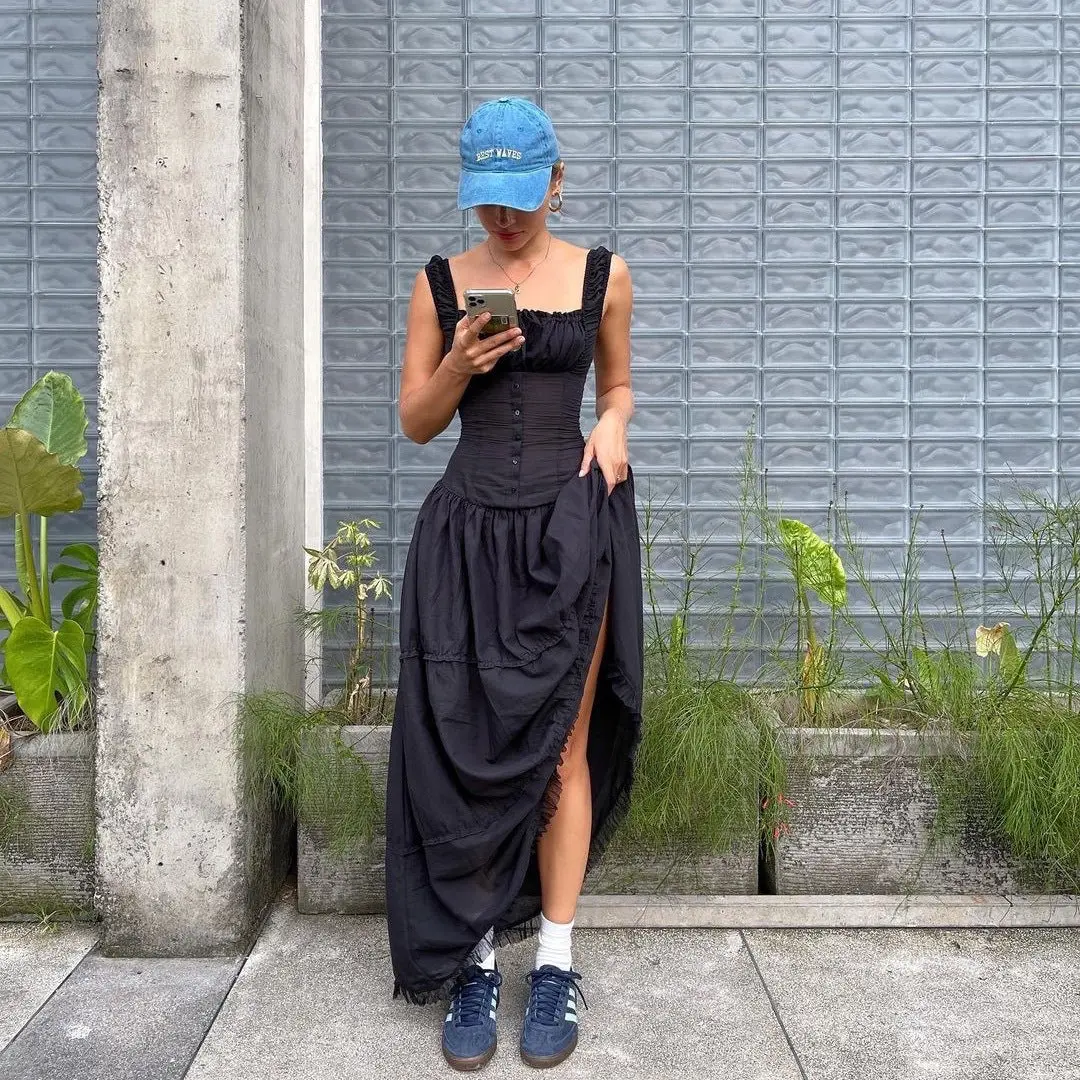 Lazy Vacation Style Pleated Front Buckle Design Extra Long Dress