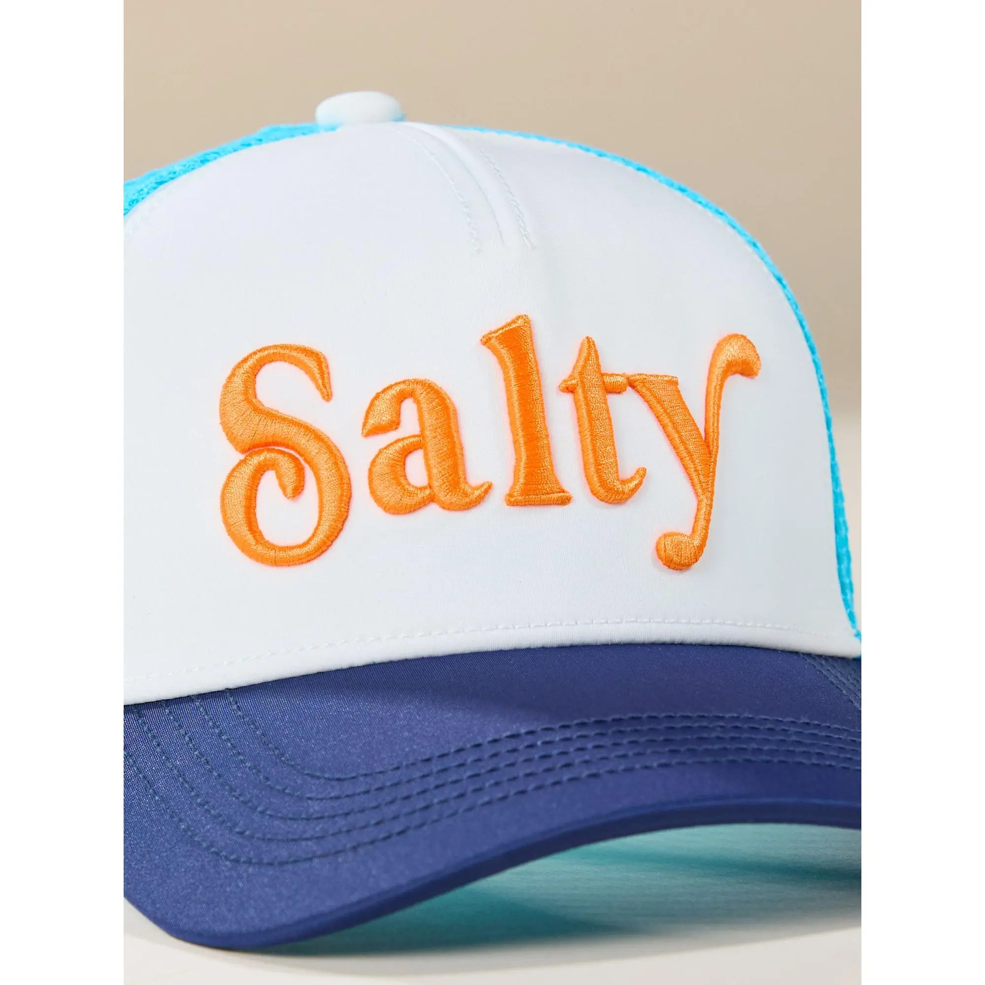 Top off your beach day with this vibrant, multi-colored trucker hat featuring bold "Salty" embroidery. The classic mesh back ensures maximum airflow, making it the perfect accessory for boat trips or afternoons by the shore.
