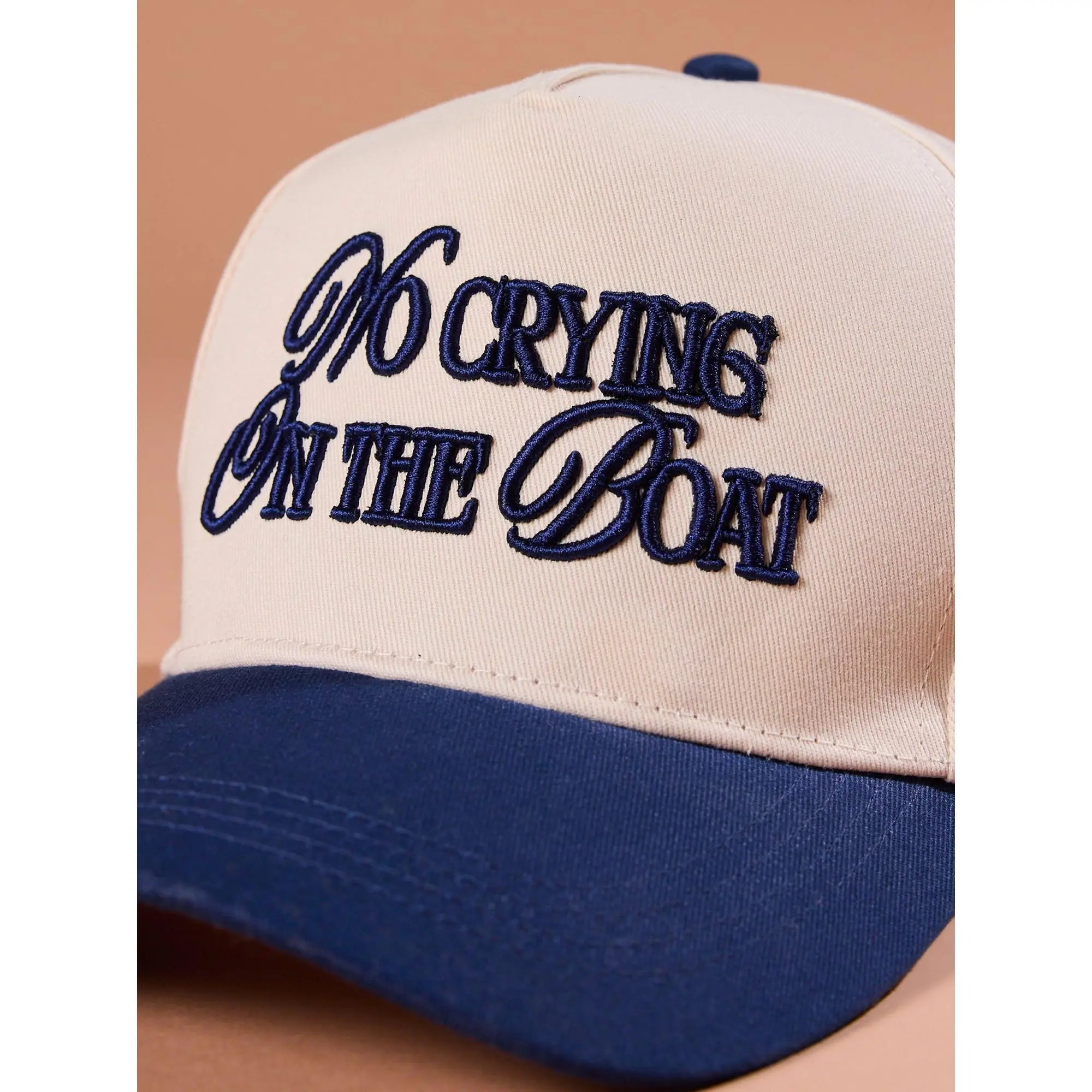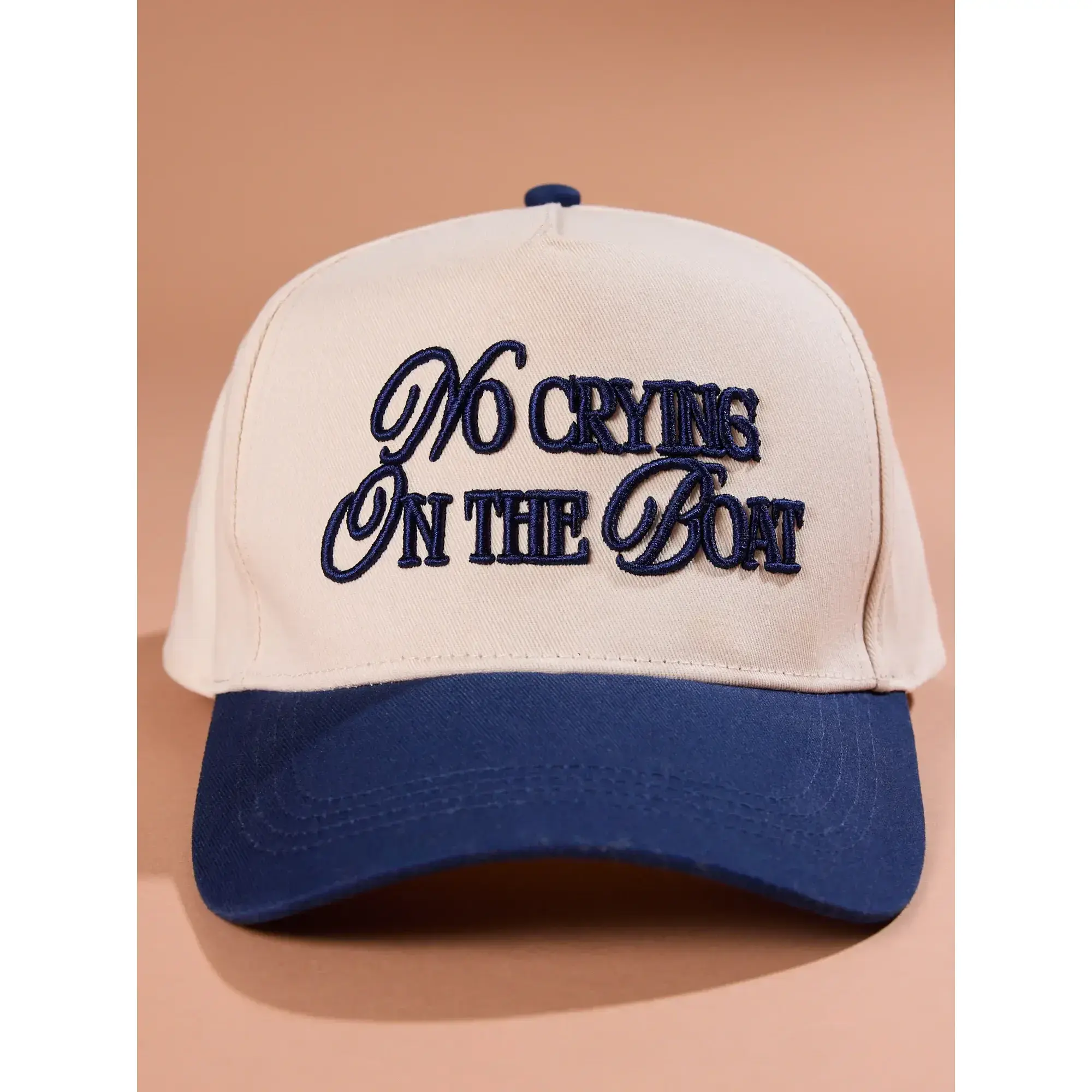 A playful and casual trucker hat featuring the “No Crying on the Boat” embroidered design. With an adjustable back, it’s perfect for everyday wear or adding a fun, nautical-inspired touch to any outfit.