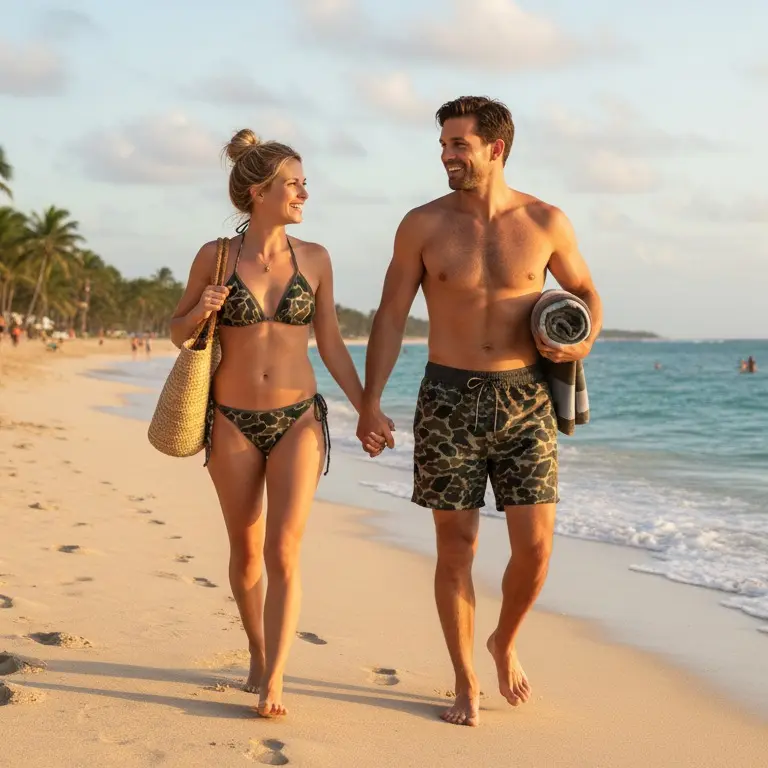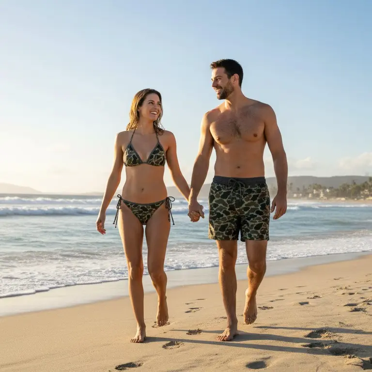 5. Strick Camo Design Couple Bikini Set – Sexy Triangle Tie Swimwear & Men’s Drawstring Beach Shorts, Summer Matching Outfit for Him & Her, Vacation Beachwear