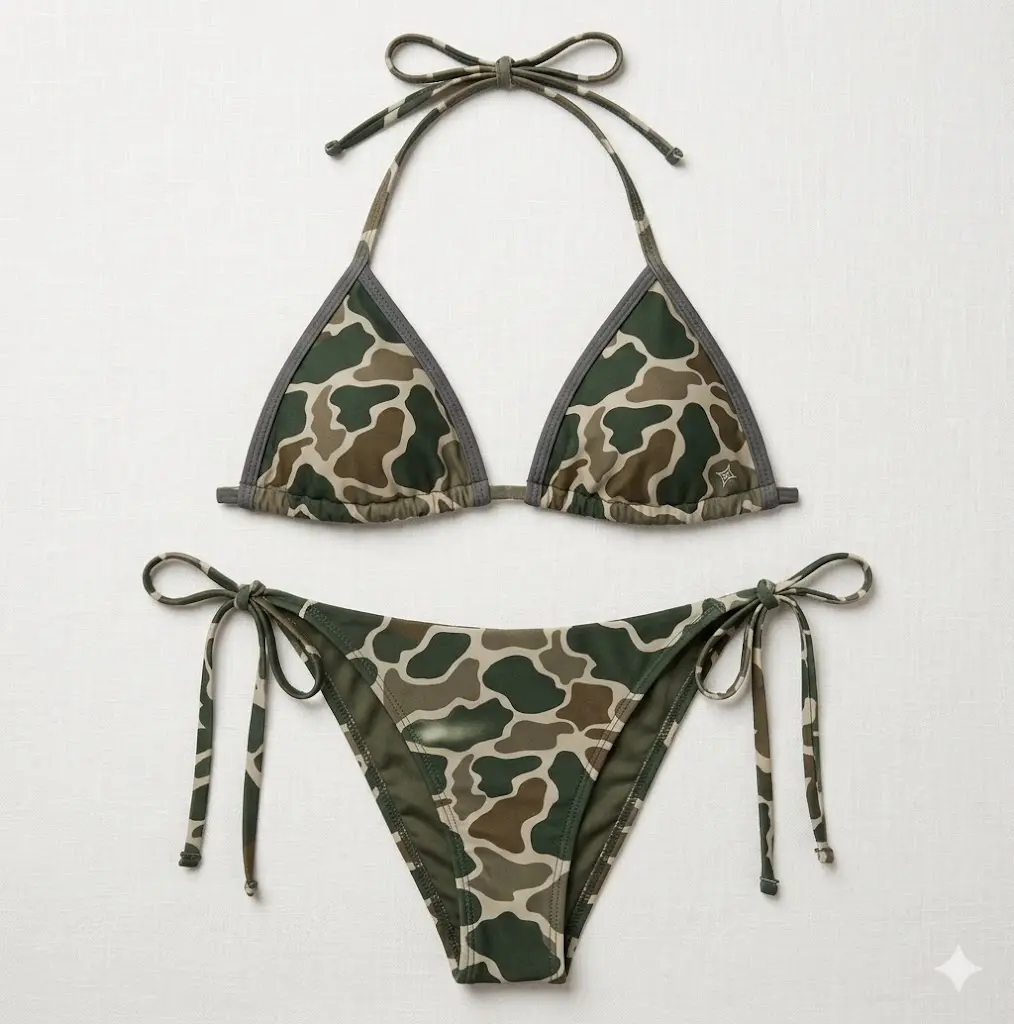 This set includes a sexy triangle tie swimwear for her and men’s drawstring beach shorts. Ideal for a summer vacation, it’s a matching outfit for him and her. The camo design adds a trendy touch to your beachwear. Perfect for couples looking to enjoy the sun together.