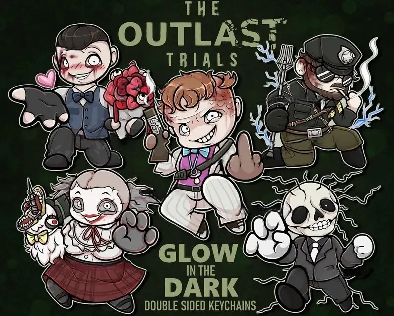 Outlast Trials Glow In The Dark Keychains - Mother Gooseberry, Officer Leland Coyle, Franco Barbi, Skinner Man, Eddie Gulskin! Kawaii Bag Charm, Key Accessory, Gift for Fans, Collectible Character Charm, for Bags, Keys, Backpacks, Cute Decor, Gift Idea