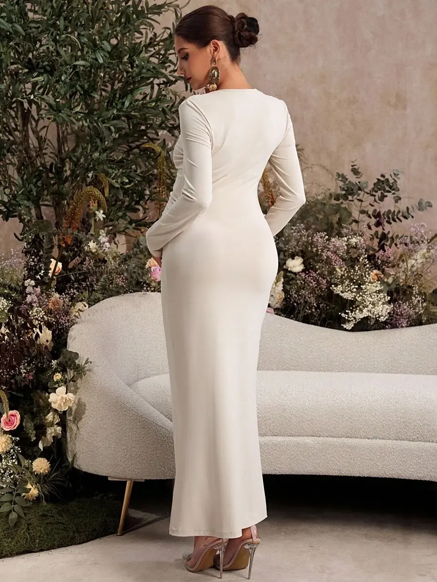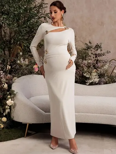 BELLAdresses Maternity Solid Color Oblique Shoulder Long Sleeve Fitted Metal Button Decor Hollow Out Dress Fall Winter Clothes Wedding Guest Dress Fairy Dress White Maternity Gown Pregnancy Photoshoot Dress Maternity Dress Long White Maternity Dress Elega