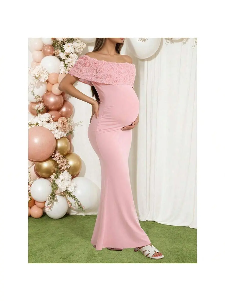 BELLAdresses Women's Pink Off Shoulder Sleeveless High-Stretch Mermaid Dress, 3D Rose Flower Knit Ruffle Asymmetric Hem Maternity Photography Party Shower Gown Spring