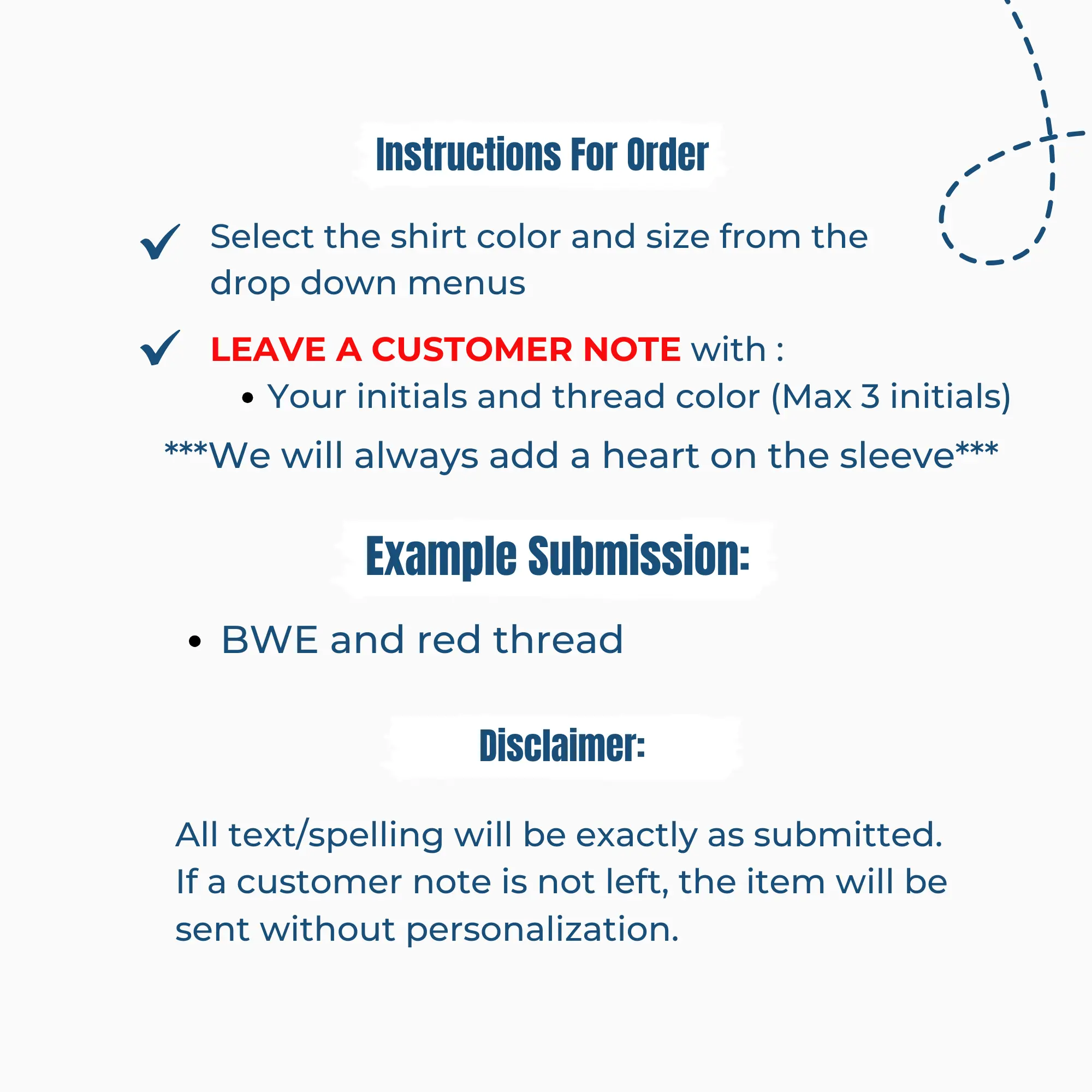 To personalize your order, please leave the following in the "Order Note" at checkout: