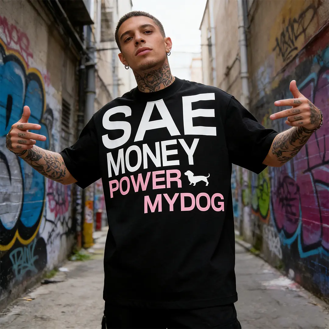 Men's "SAE MONEY POWER MY DOG" Funny Dog Print T-Shirt, 100% Cotton Oversized Streetwear