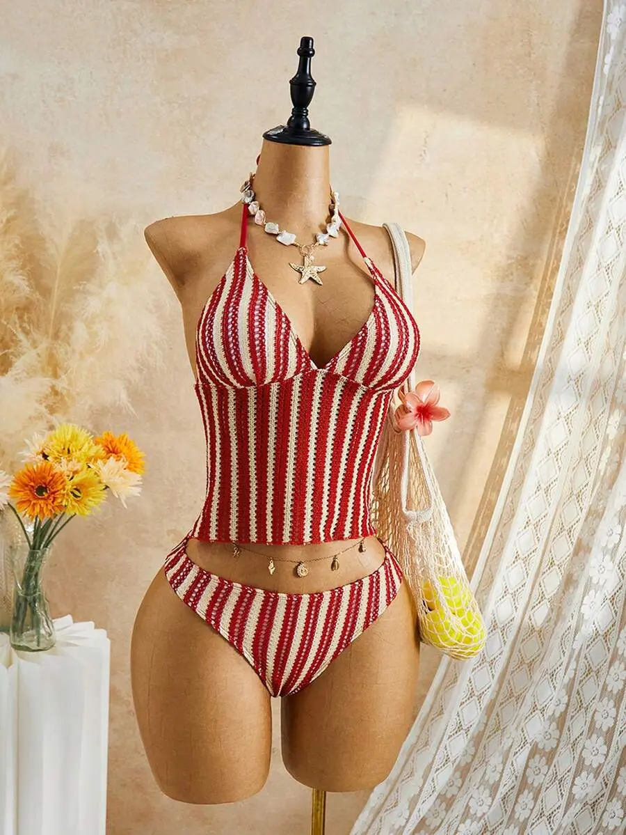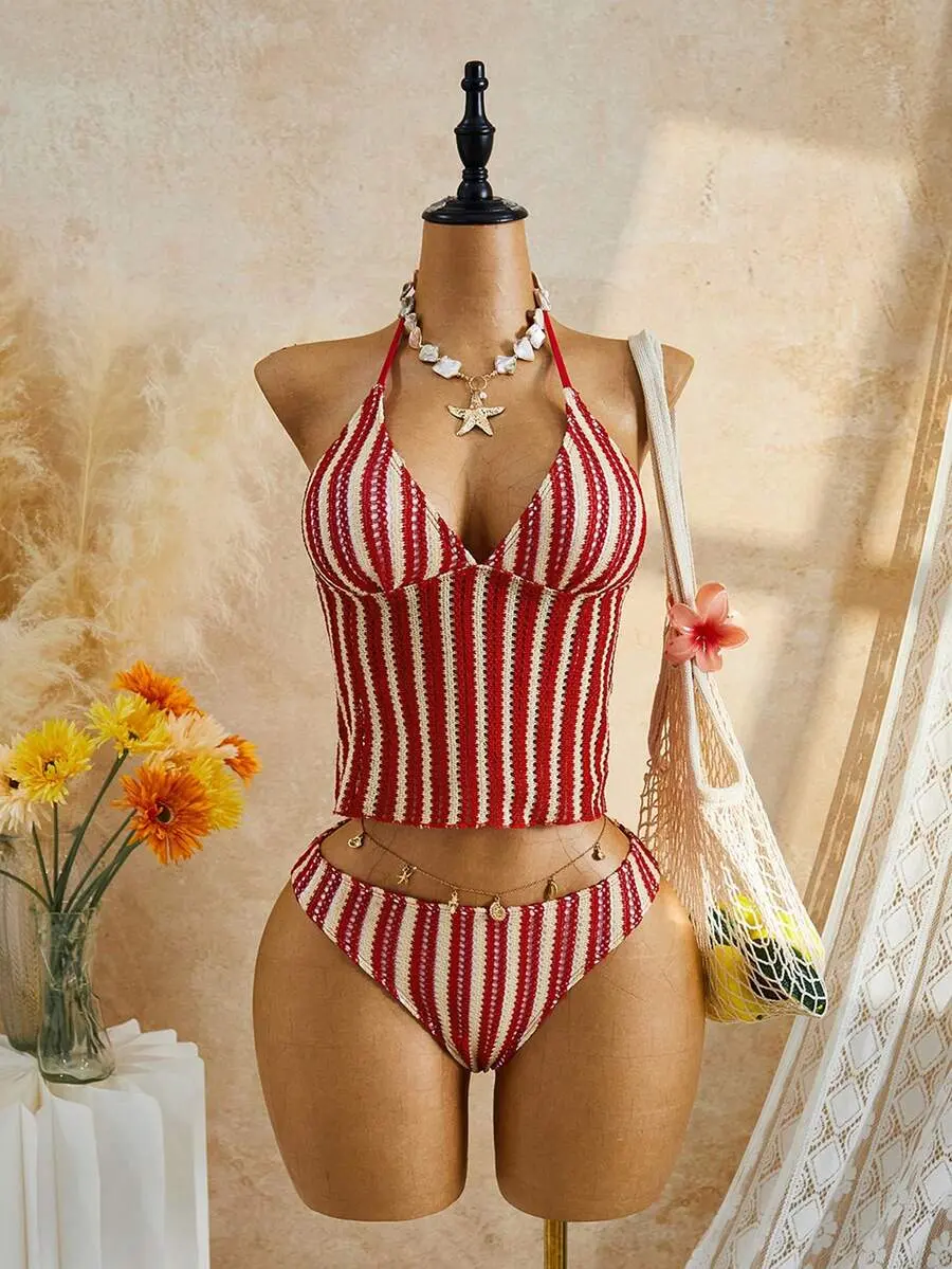 ROSY x Women's Summer Beach Striped Halter Tie Fashionable Tankini Swimwear Set