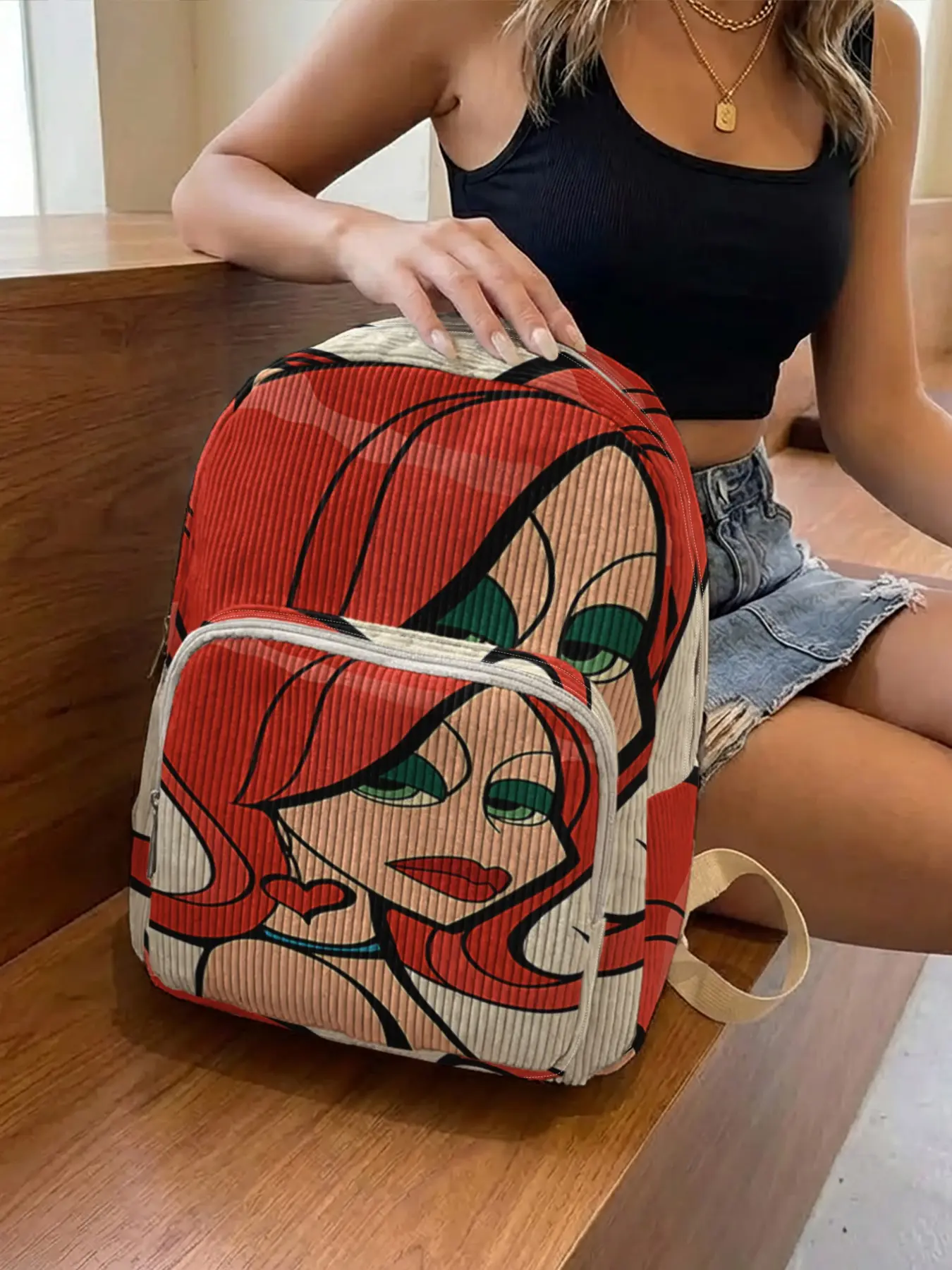1 piece of 2D printed lady's backpack with red-haired character pattern, chenille texture + layered storage + lightweight and easy to carry|Perfect for students to go to class/shopping/short trips|Combines atmosphere with practicality