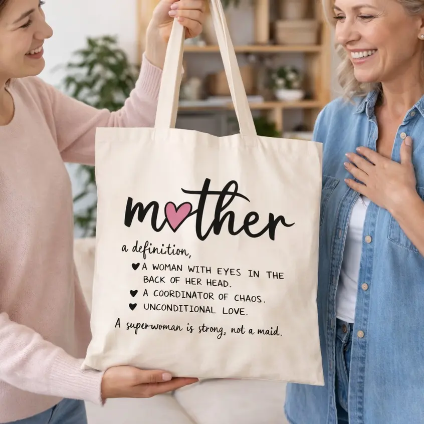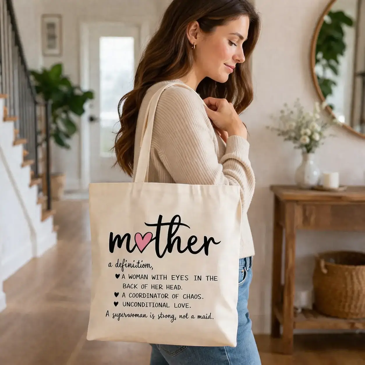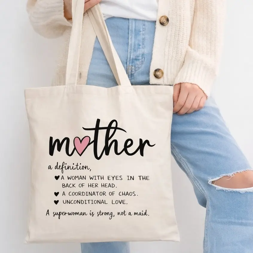 ✨ Mother Definition Tote Bag is an ideal Mother's Day gift. It's a strong mom bag, perfect for moms who need a reliable tote. This mom stuff tote is a thoughtful gift from kids, showing appreciation. It's also a super woman bag, celebrating mom's strength. Ideal for her, this tote bag is a meaningful present.