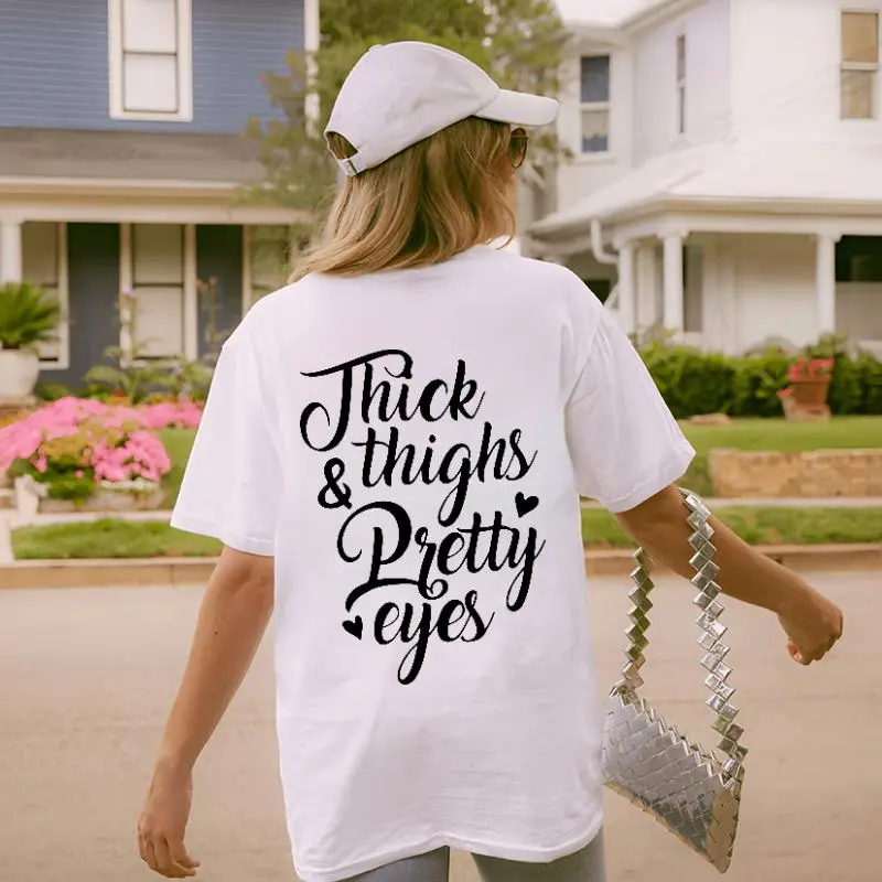 THICK THIGHS & PRETTY EYES PRINT WOMEN'S T-SHIRT, Ladies Summer Outfit, Gift For Women, Mothers Day Gift, Gift For Girl Friend, Full Size, Full Color