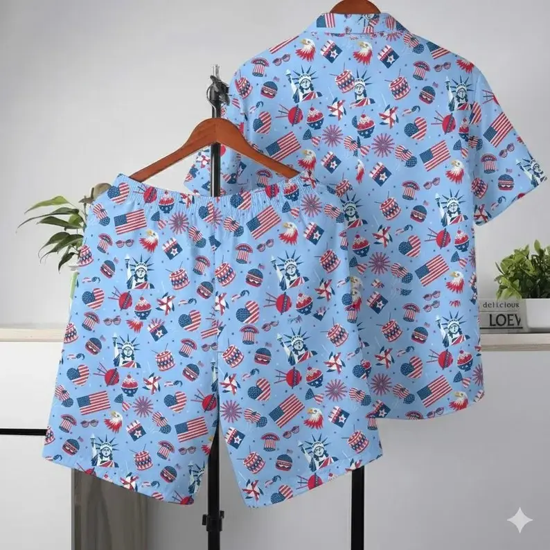 4th of July Hawaiian Shirt Shorts Set Women Men Statue of Liberty American Flag Bald Eagle Print Loose Beach Vacation Summer Outfit Matching Set