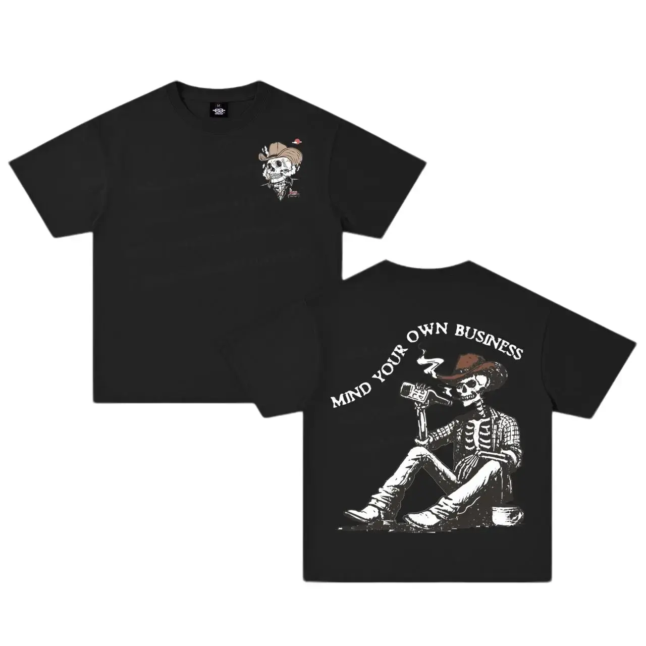 Mind Your Own Business Skeleton Cowboy T-Shirt, Funny Western Graphic Tee, Vintage Outlaw Skull Shirt Gift for Men Women, Retro Country Style