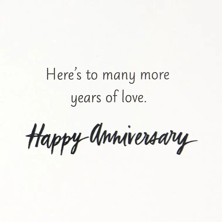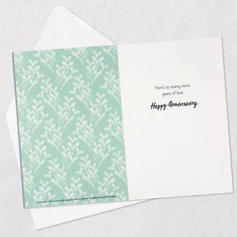 Anniversary greeting card features a removable wood sign with laser-cut greenery, white script lettering and a gray ribbon bow and hanger.