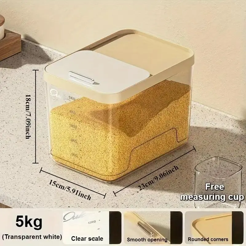 Airtight Cereal Container, 5kg Clear Rice Storage Bin with Scale Markings for Kitchen Countertop & Pantry