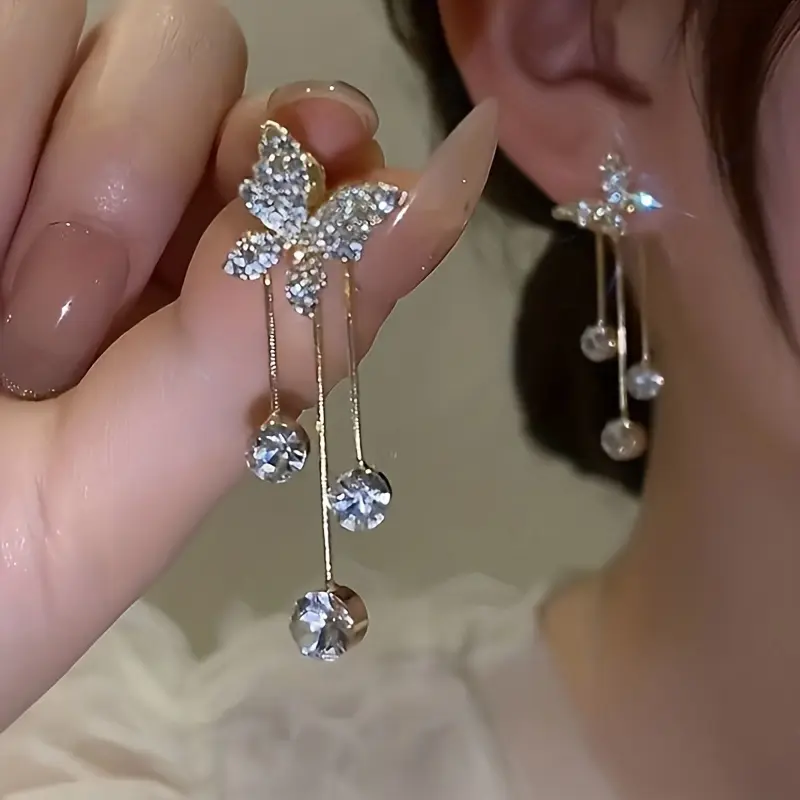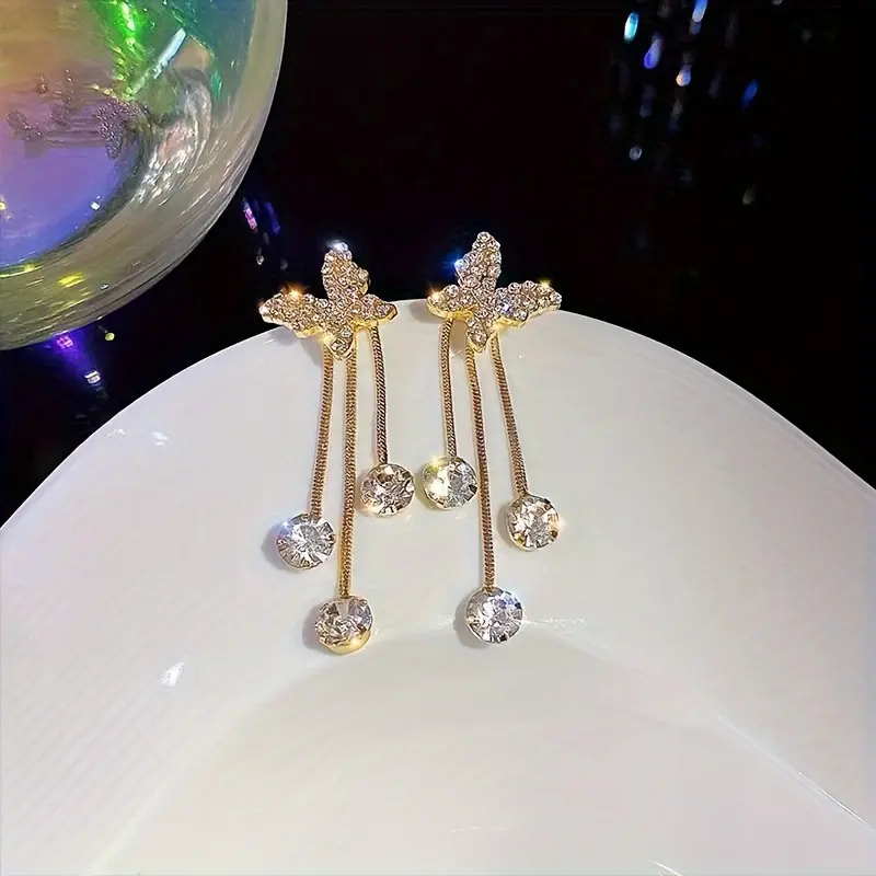 New Fashion Rhinestone Inlaid High-end Butterfly Earrings, Two Pairs of Sweet and Fresh Tassel Style Shiny Women's Earrings