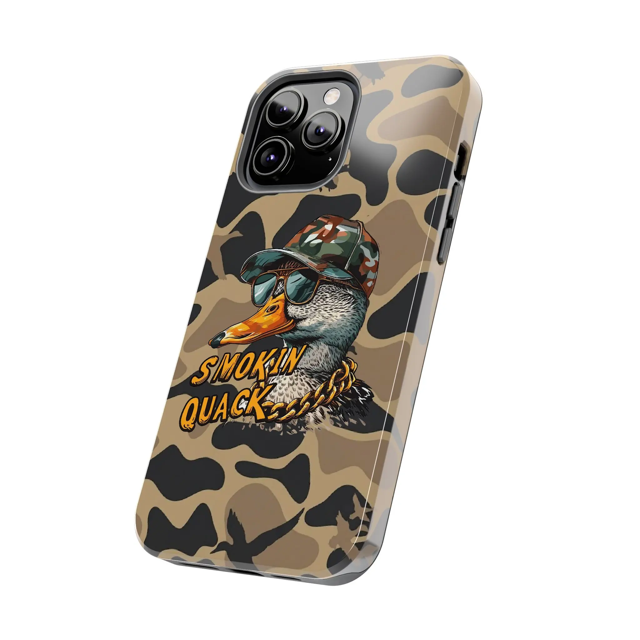 Unleash your rugged and humorous side with this high-energy "Smokin' Quack" camouflage phone case. Featuring a detailed illustration of a duck with a camouflage cap, sunglasses, and a gold chain, all on a disruptive camo print background, this case perfectly blends bold hip-hop swagger with classic hunting vibes. The stylized text "SMOKIN QUACK" adds a touch of playful attitude, making it an excellent choice for those who appreciate a unique and edgy design.