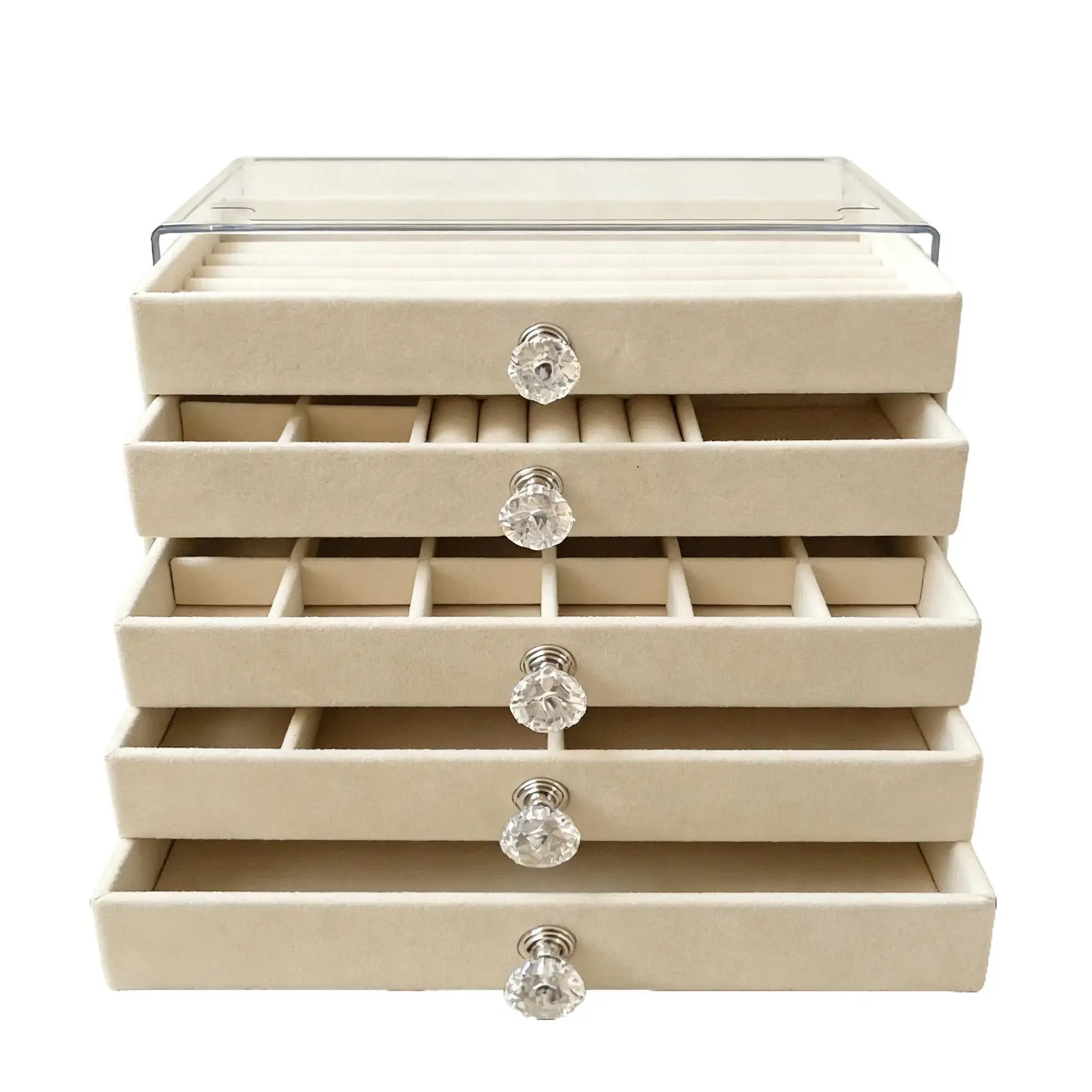 Five-Layer Large Capacity Storage Featuring five pull-out drawers with different internal layouts, this organizer provides ample space for all your treasures. From rings and earrings to necklaces and chunky bracelets, the logical partitioning helps you declutter your space and keep your jewelry tangle-free