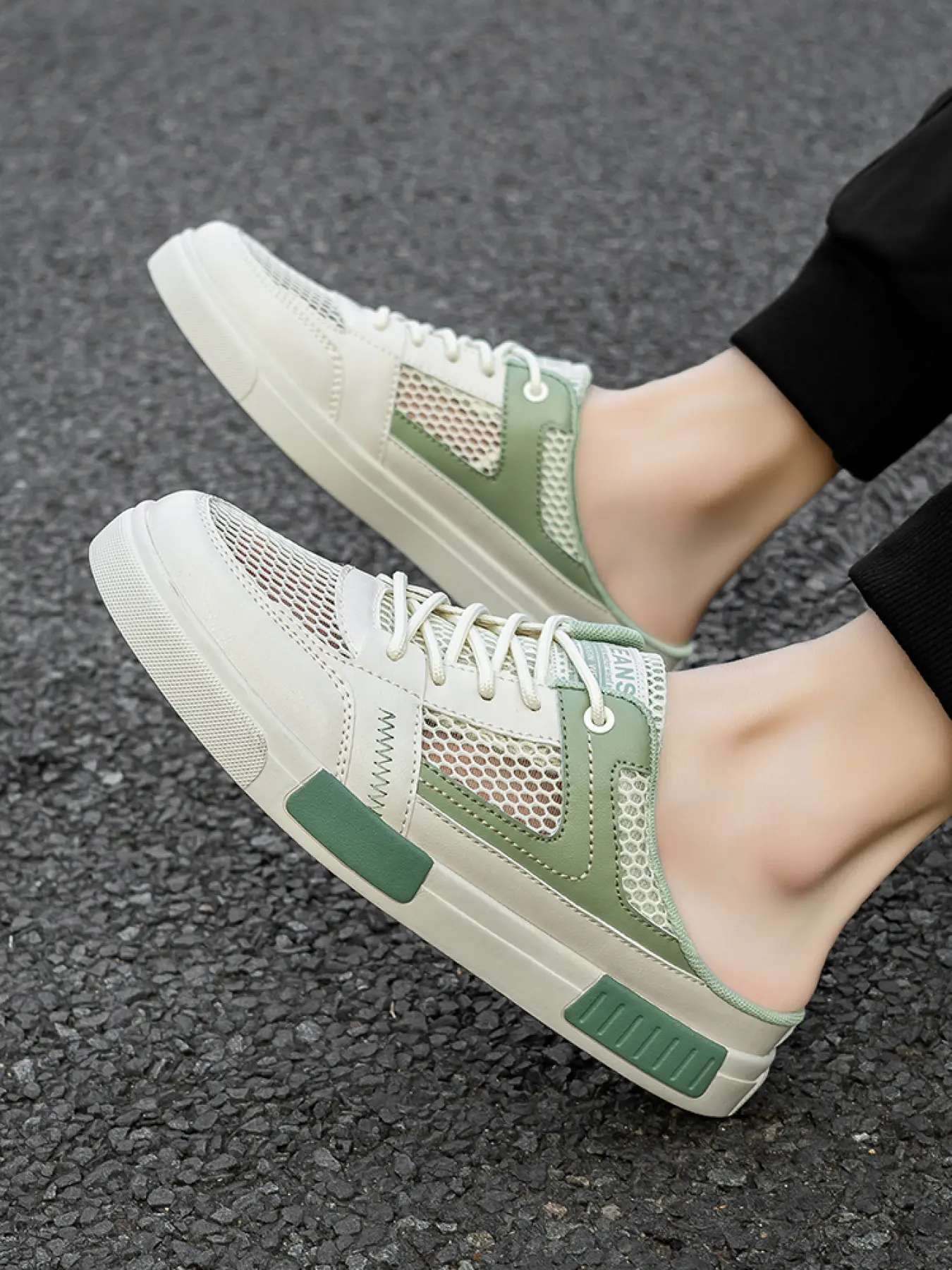 Men's Beige-Green Mesh Mule Sneakers: Breathable Slip-On, Summer Casual Shoes