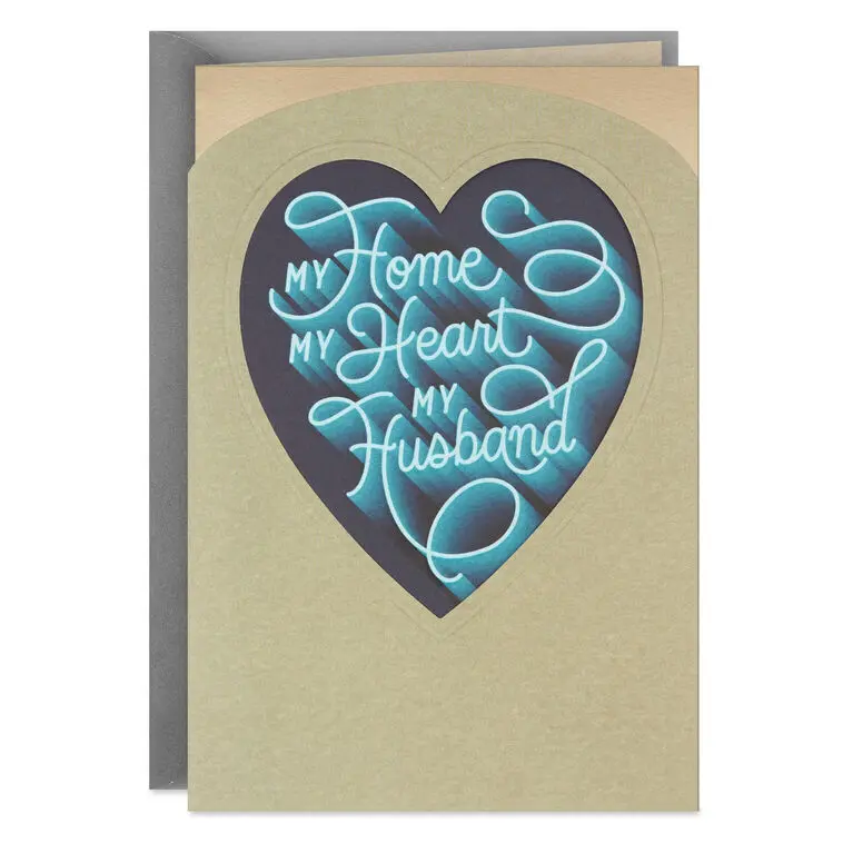 Anniversary greeting card for husband features a sweet message in vivid shadow lettering within a stylish heart design on a light tan background. Die-cut, embossed and foil accents.