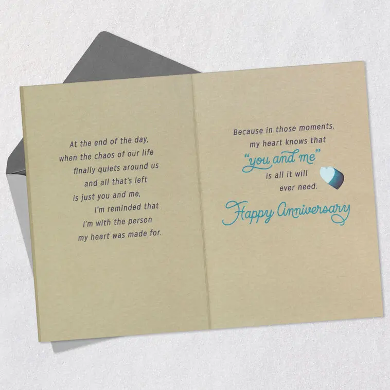 Inside message: At the end of the day, when the chaos of our life finally quiets around us and all that's left is just you and me, I'm reminded that I'm with the person my heart was made for. Because in those moments, my heart knows that "you and me" is all it will ever need. Happy Anniversary